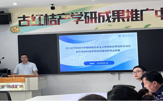 为持续推动学习贯彻习近平新时代中国特色社会主义思想主题教育走深走实,按照学院党委关于《2023年党委委员和各级党组织书记讲专题党课实施方案》的工作安排,6月13日下午,学院党委委员、副院长袁德梽到农林科技学院为全体教师作学习贯彻习近平新时代中国特色社会主义思想主题教育专题党课。专题党课由农林科技学院党总支书记丁廷发主持。