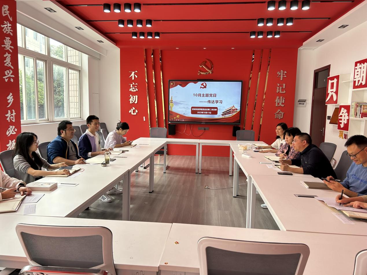 2023年10月17日,农林科技学院第二党支部在农林楼203会议室开展10月主题党日活动,会议由支部书记吴琼同志主持,李晓曼同志领学。