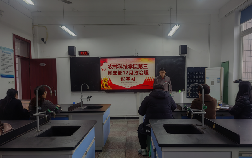 2024年12月6日中午,农林科技学院第三党支部在农林楼308室召开会议,进行了12月份的“三会一课”及主题党日学习,本次会议由支部书记刘一丁同志主持,支部共11名同志参加,其中积极分子3人。