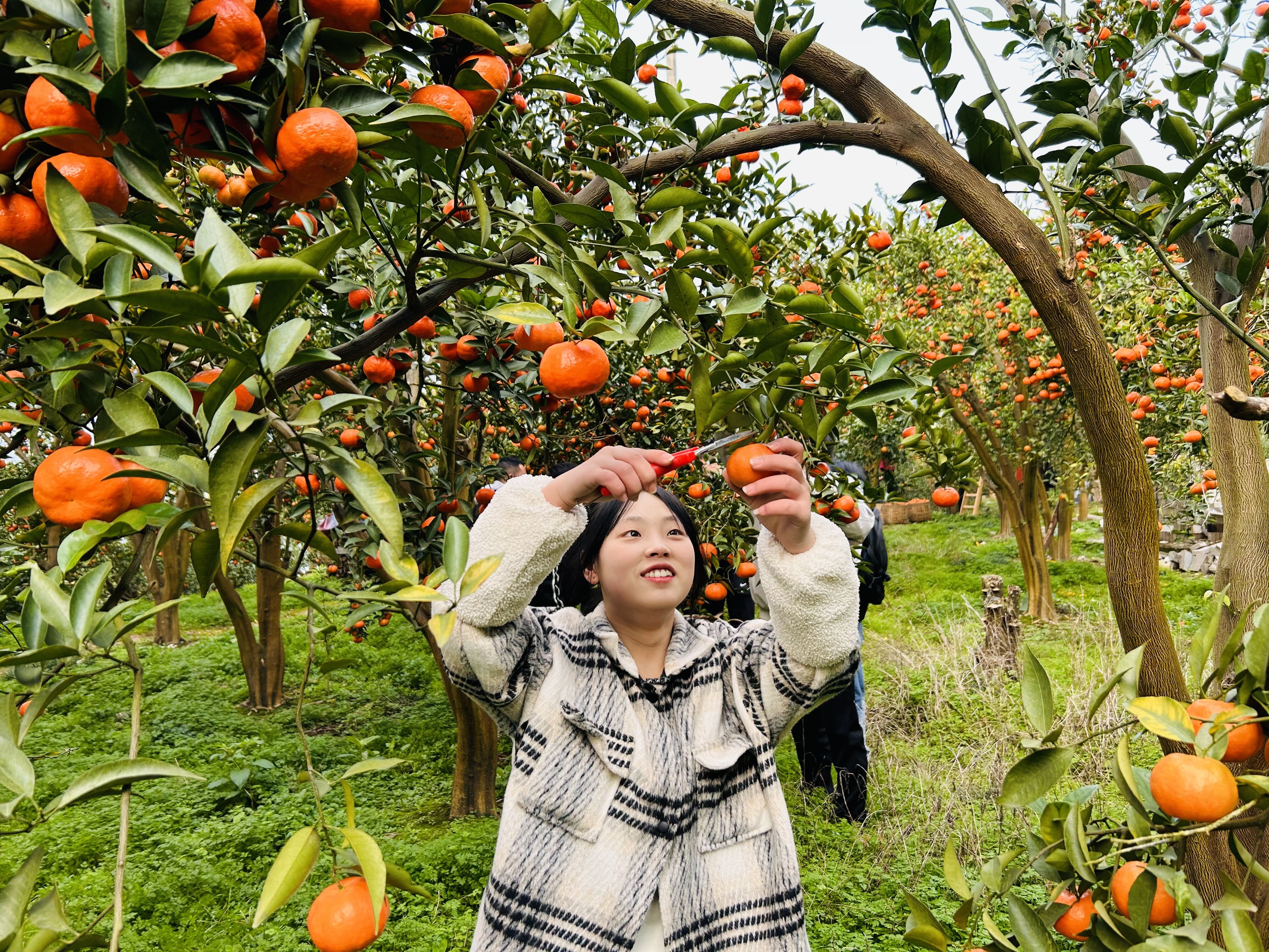 初冬的果园,色泽光亮的红桔缀满枝头,散发出阵阵橘香。同学们两两一组,一人用剪刀采果,一人牵引树枝,经过一天的劳作,共完成红桔采摘装运3000余斤。一颗颗大大的桔果背后是沉甸甸的丰收喜悦,一口口酸甜就是收获幸福的滋味。