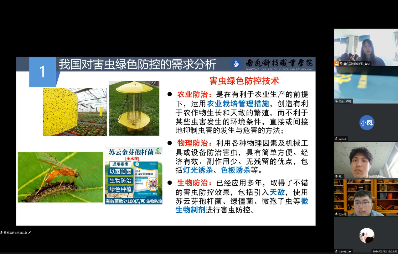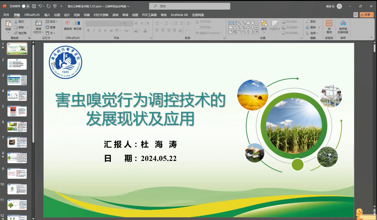 为丰富植物保护与检疫技术专业教学资源库建设活动,2024年5月23日农林科技学院特邀请南通科技职业学院杜海涛博士开展题为《害虫嗅觉行为调控技术的发展现状及应用》的前沿专题讲座。