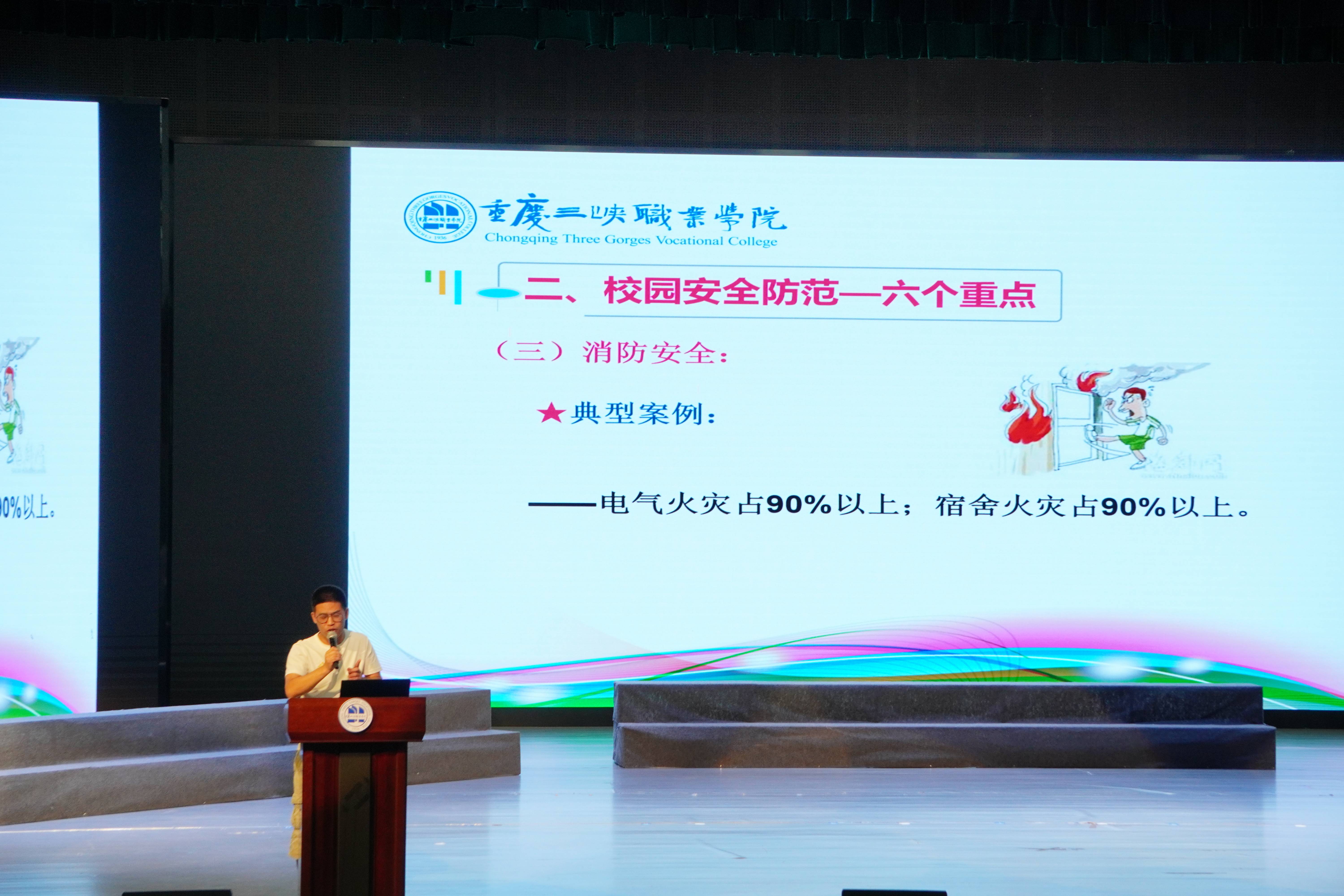 安全处宋兴元老师从宿舍用水用电安全、火灾逃生注意事项、金融诈骗、校园贷危害等方面为同学们进行案例分析,鼓励同学们积极参加学校组织的法制和安全教育活动。