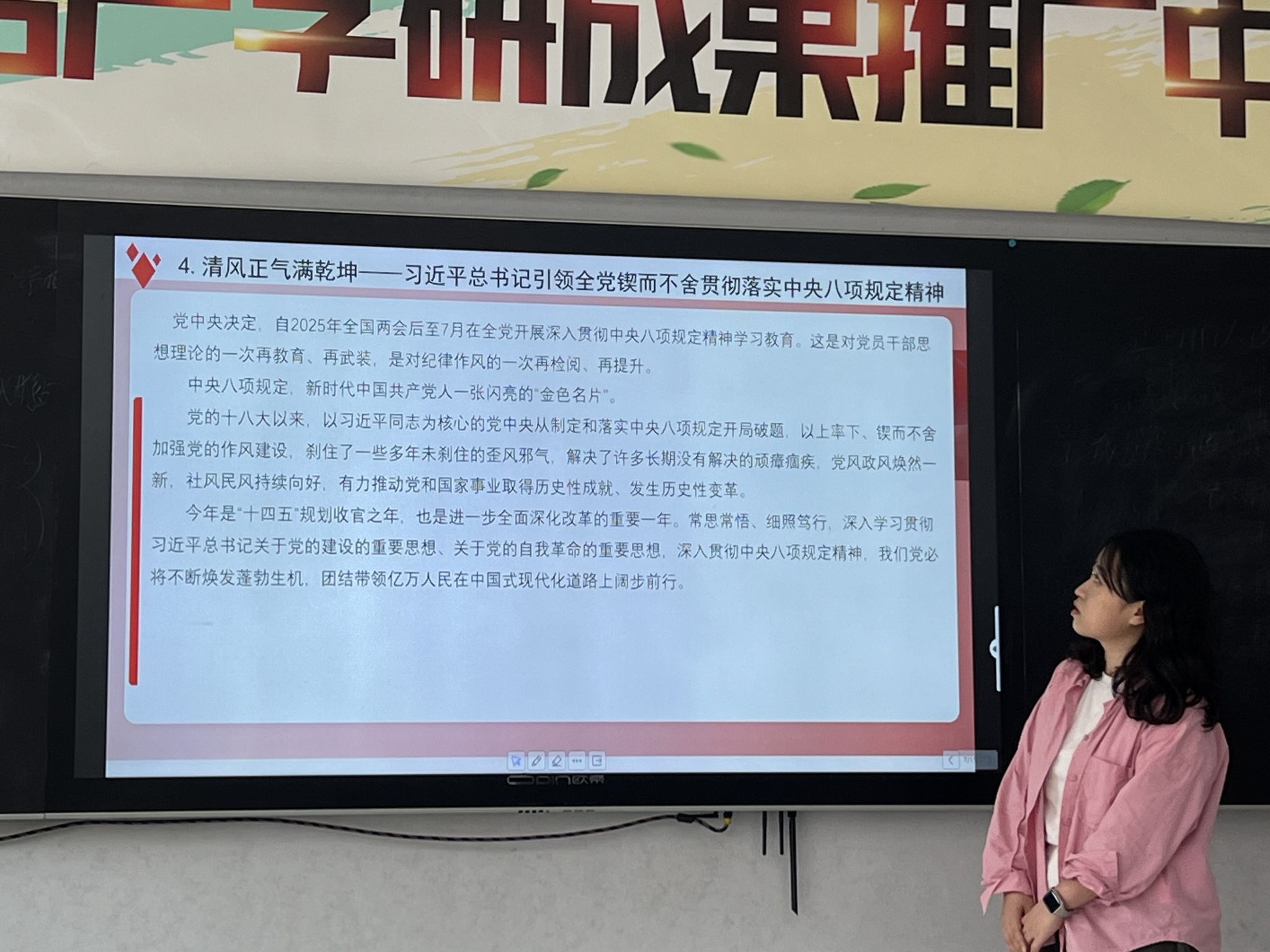 在政治理论和师德师风专题学习环节,孟珂宇老师充分发挥引领作用,带领全体教职工深入学习了习近平总书记在贵州、云南考察时的重要讲话精神、中央八项规定及其实施细则精神、以及《高等学校教师职业道德规范》《新时代高校教师职业行为十项准则》等重要文件。