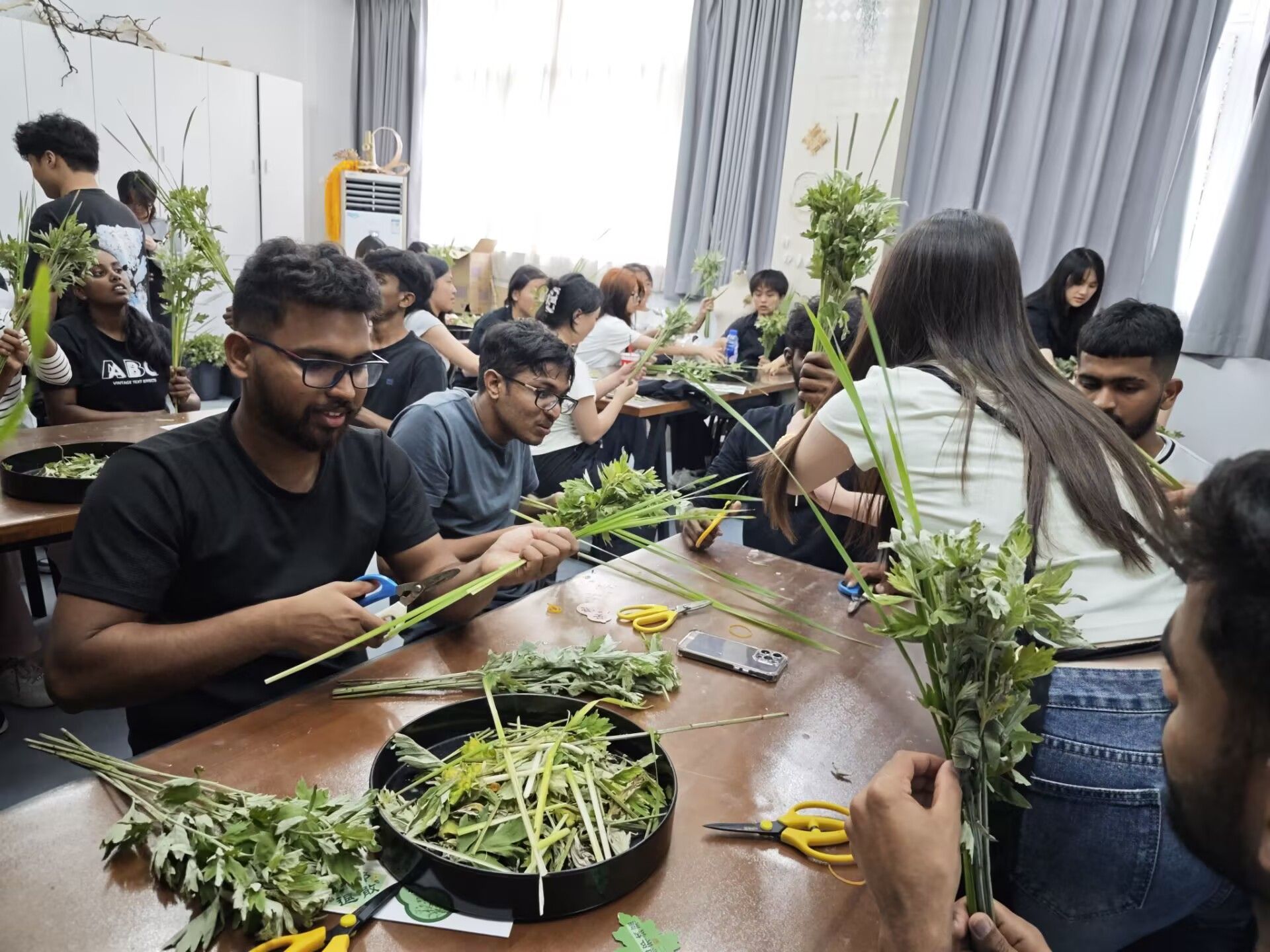 留学生们对活动表现出了极大的热情和好奇心。他们虽然手法略显生疏,但在中国同学的帮助下,逐渐掌握了包粽子的技巧。有的留学生包的粽子形状独特,引得大家阵阵欢笑;有的则认真专注,力求将自己的粽子包得完美无缺。在制作艾草花束的过程中,大家充分发挥创意,将艾草、菖蒲与各种花卉巧妙搭配,一束束独具特色的艾草花束在手中诞生。
