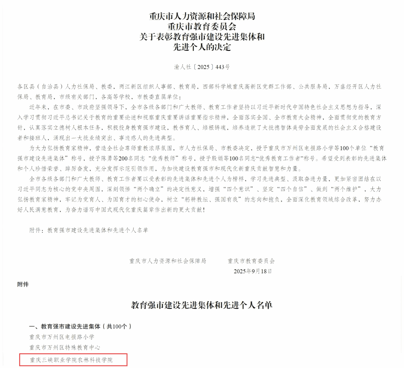 近日,重庆市人力资源和社会保障局与重庆市教育委员会联合印发了《关于表彰教育强市建设先进集体和先进个人的决定》,重庆三峡职业学院农林科技学院荣获“教育强市建设先进集体”称号。这一荣誉不仅是对学院长期以来在职业教育领域辛勤耕耘和突出贡献的高度认可,也是对全体师生共同努力的极大鼓舞。