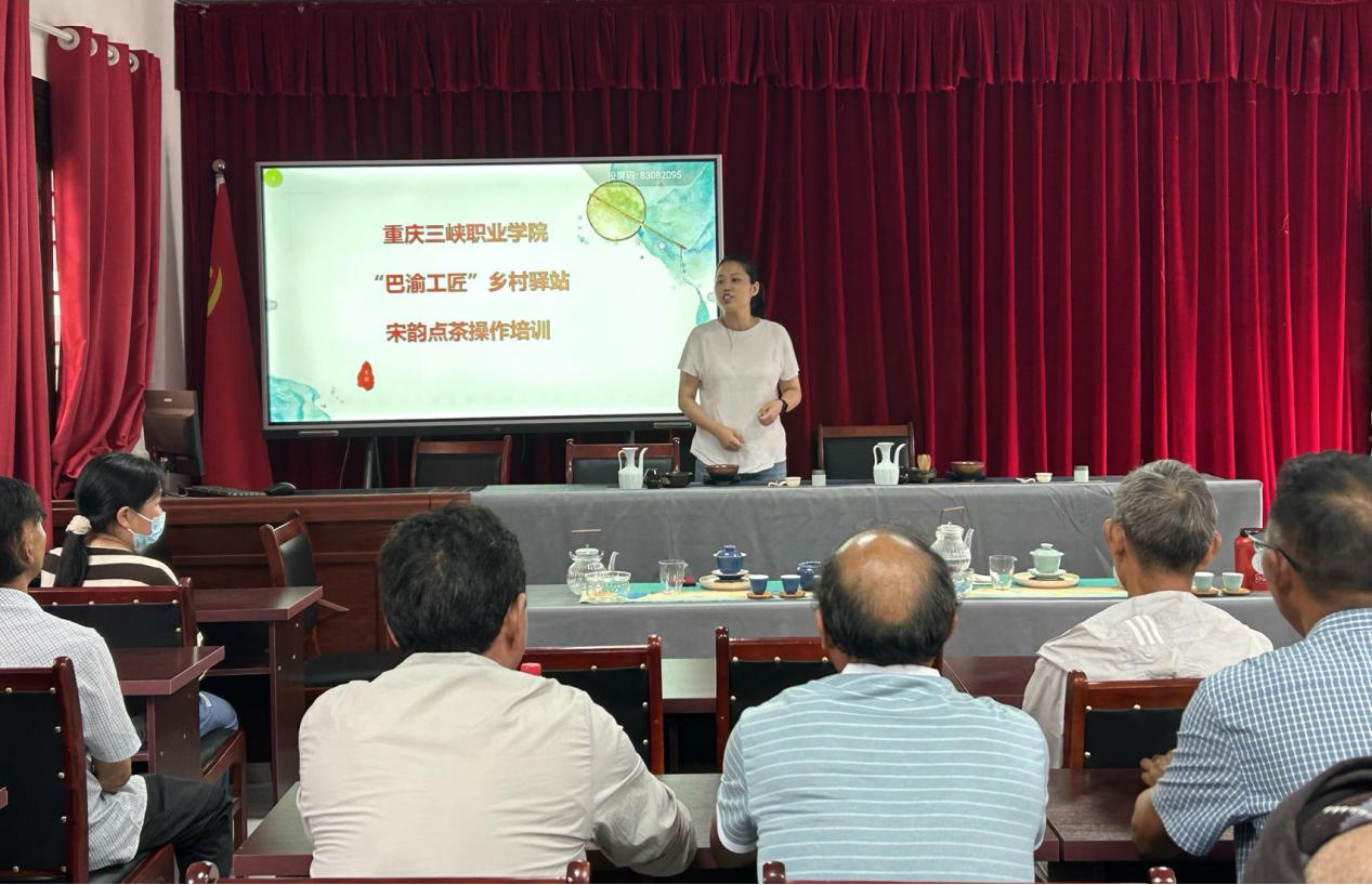 学院“巴渝工匠”乡村驿站赵琳团队工匠大师工作坊认真贯彻党的二十大精神,为更好的弘扬优秀传统文化,坚持以“传承+创新”技能人才建设为引领,践行大国工匠精神。2023年6月28日,“巴渝工匠”乡村驿站茶艺团队受恒合乡委托,为恒合乡五星村茶产业公司、农户等20家开展“理论+现场教学”的宋韵点茶培训,努力传承非物质文化遗产,探索构建更具吸引力和竞争力的技能人才培育体制机制。