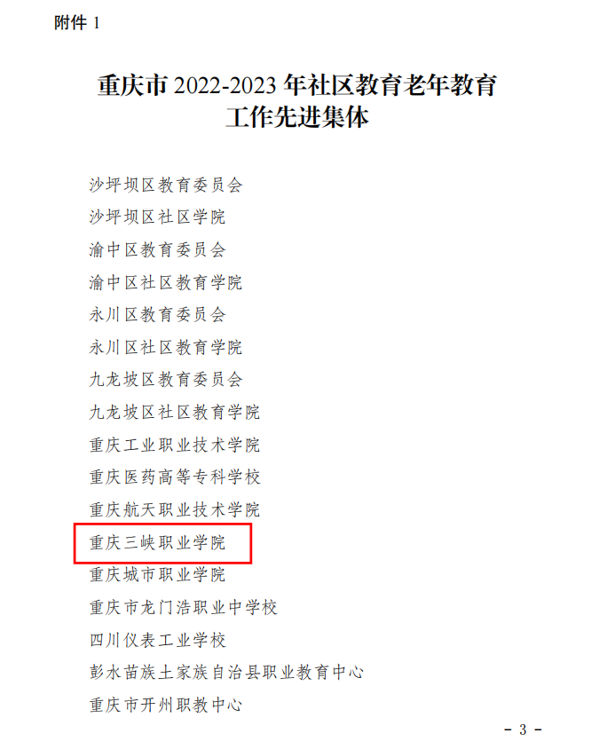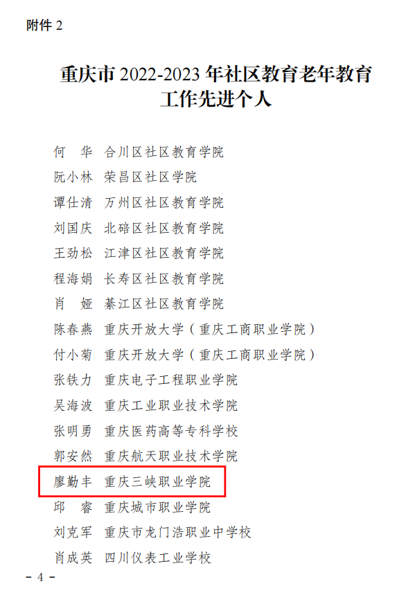 2024年5月,重庆市教育委员会发布了关于2022-2023年度社区教育老年教育工作先进集体和先进个人的通报,我院继续教育工作受到了重庆市教育委员会肯定和表彰。我院荣获2022-2023年重庆市社区教育老年教育工作先进集体,培训学院(乡村振兴学院)副院长廖勤丰同志荣获先进个人称号,为我院继续教育事业发展收获又一市级表彰。
