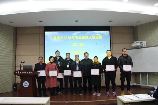 11月27日上午,我校承办的2019年重庆市农业经理人培训二期班在我校博雅楼207教室举行本阶段结业仪式。学校党委委员、副校长赵福奎,继续教育学院院长黄礼岗,经济管理学院党总支副书记陶毅出席了结业仪式。仪式由陶毅主持。