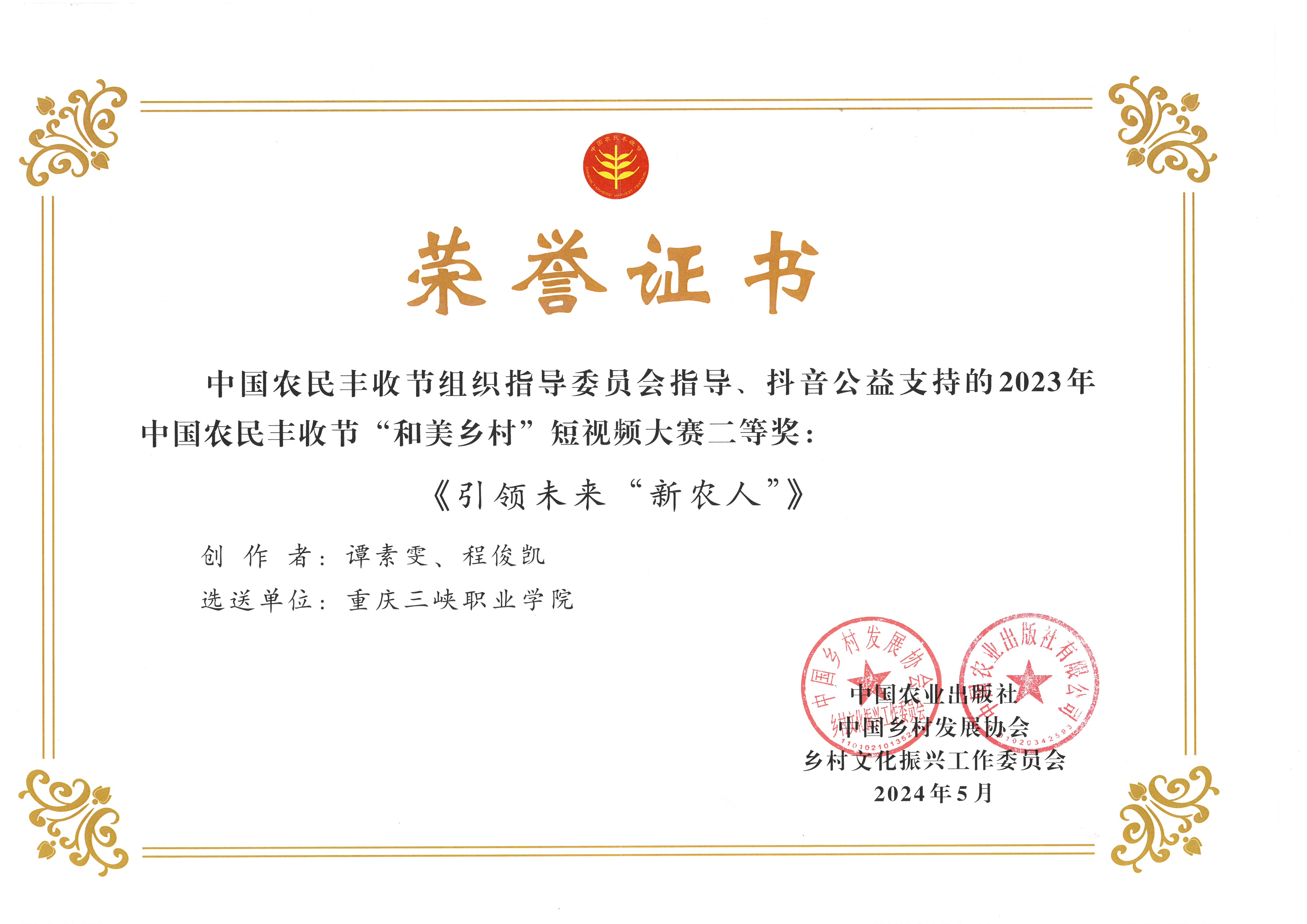 2024年7月11日,我院教师谭素雯、程俊凯在2023年中国农民丰收节“和美乡村”短视频大赛中取得了优异成绩,荣获二等奖。