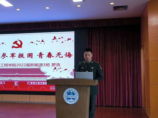 活动中,曾在西藏日喀则中印边境参军的退伍军人罗浩向大家分享了他的军旅生活。他讲述了自己在部队中的所见所闻、所思所想以及返校后对部队培养自己成长的感激之情和对部队生活的眷念之情,他鼓励更多的热血青年能像自己一样选择投笔从戎、进入部队,将爱国情怀投入强军梦里。