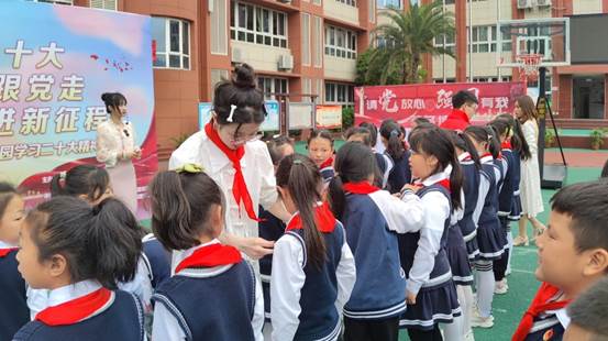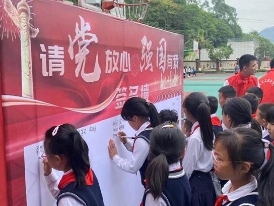 随后,大家来到户外,共青团员与少先队员彼此互换了团徽红领巾,一起重温了入队誓词,并携手在“请党放心 强国有我”的主题签名墙上郑重地签上了自己的名字。