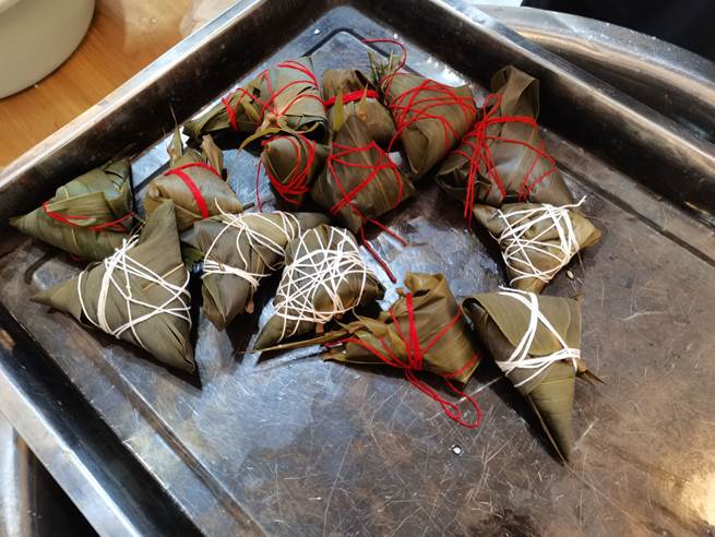 上午八点,同学们已经准备好材料:糯米、粽叶、红豆、红枣、腊肉等。下午两点,大家开始大展身手,在教工食堂开始包粽子,填糯米、放红枣、裹叶子、扎线……只见一双双巧手在欢声笑语中上下翻飞,很快三角形、喇叭形、牛角形、长条形等各式各样或纤细或壮实的漂亮粽子就这样一个个在同学们的手中诞生了。看着自己包出来的形态各异的粽子,大家忍不住哈哈大笑,活动场上到处充满了欢乐的气氛。