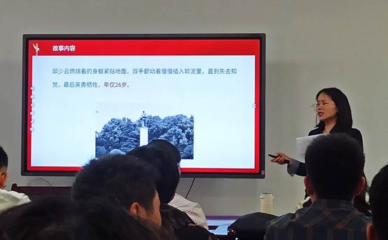 马丽老师从邱少云烈士的成长经历讲到他的英雄事迹,马丽老师生动的讲解为在座的师生再现了一幕邱少云烈士为不暴露目标任凭烈火烧焦身体也一动不动的感人场景,让我们深深体会到邱少云烈士崇高的集体主义精神和顽强的革命意志。马丽老师最后说道:“在今后的学习生活中,我们要倍加珍惜来之不易的美好生活,树立远大人生目标,振奋精神,发扬艰苦奋斗的革命精神,为实现中国梦而努力奋斗。”