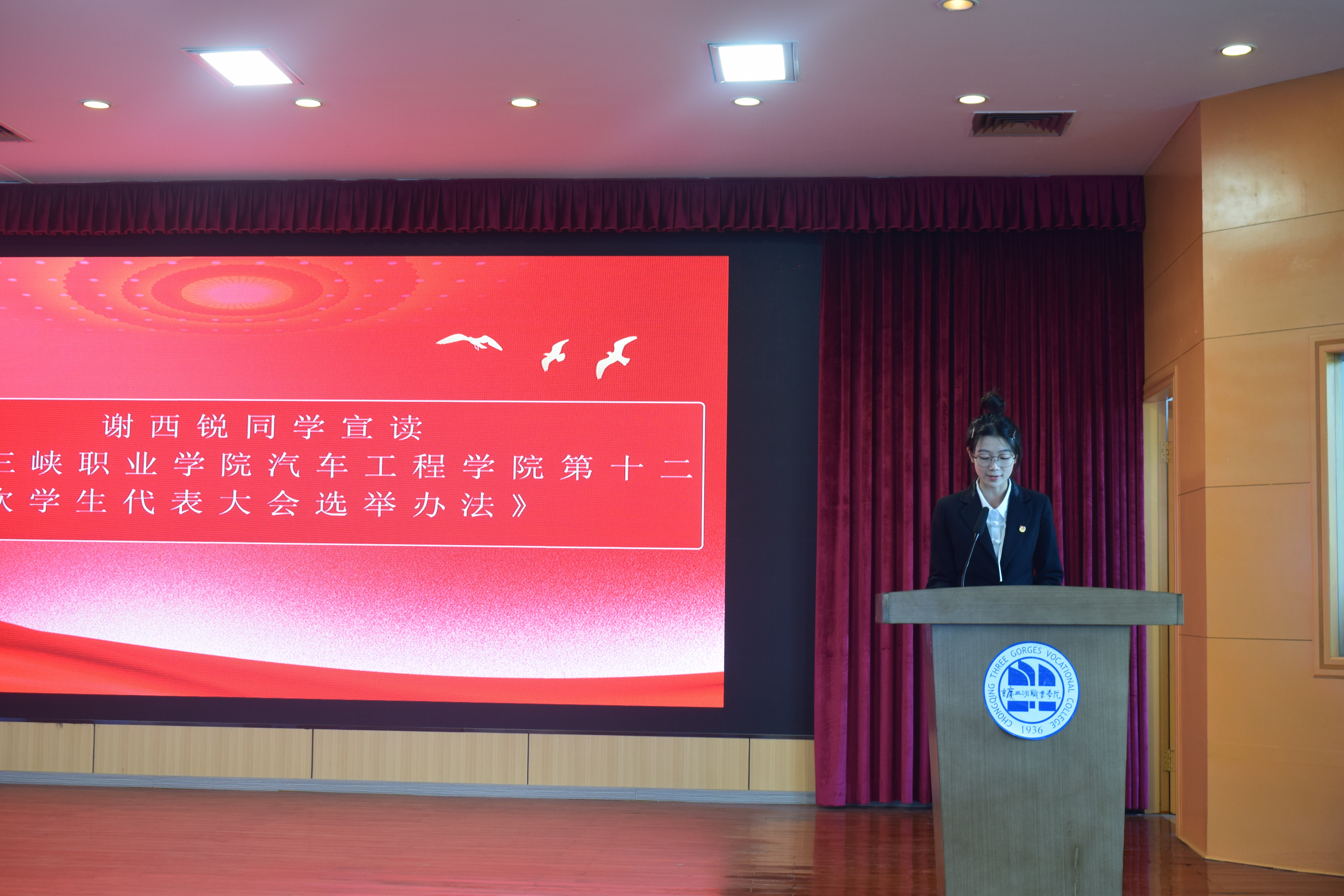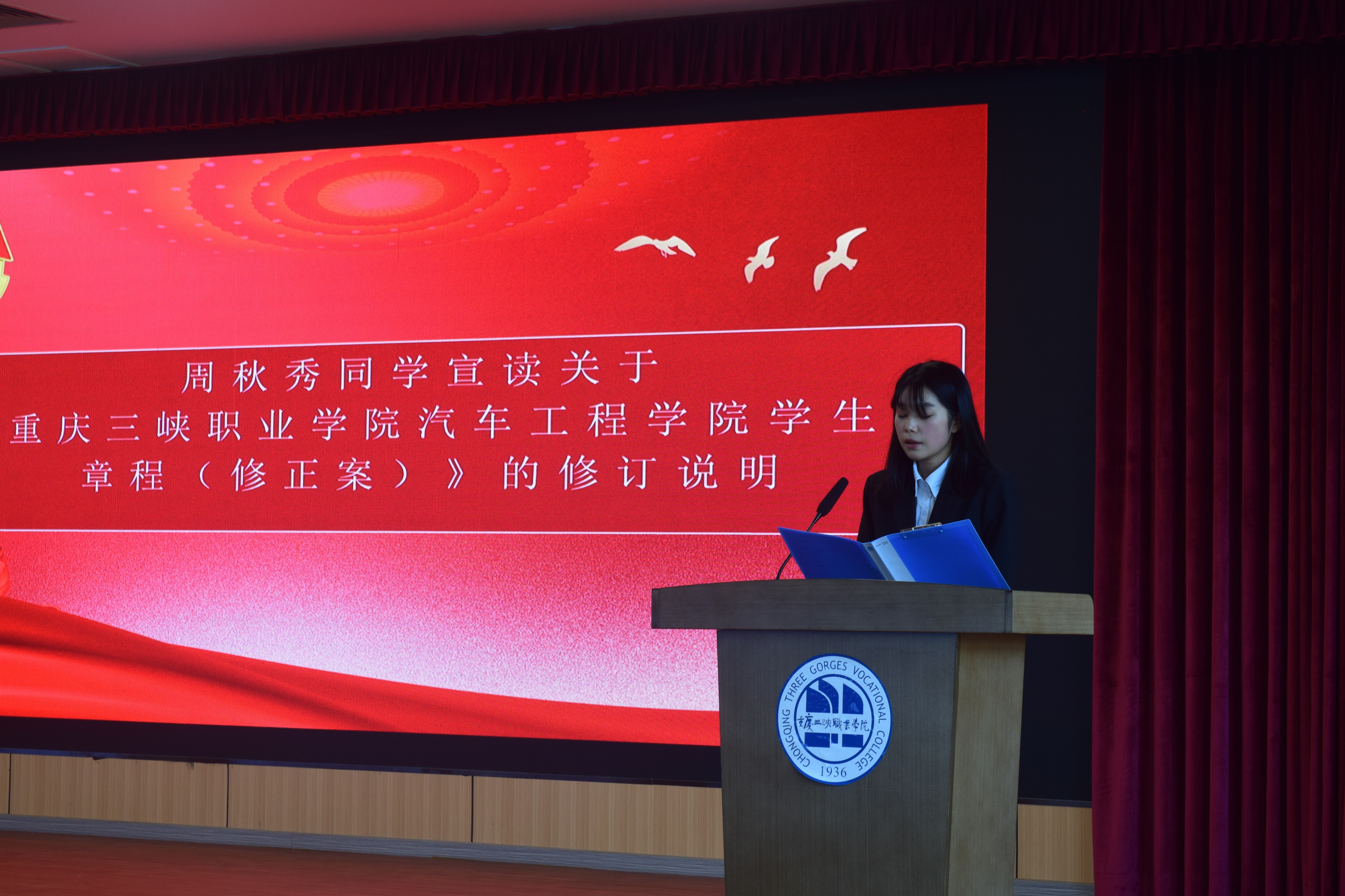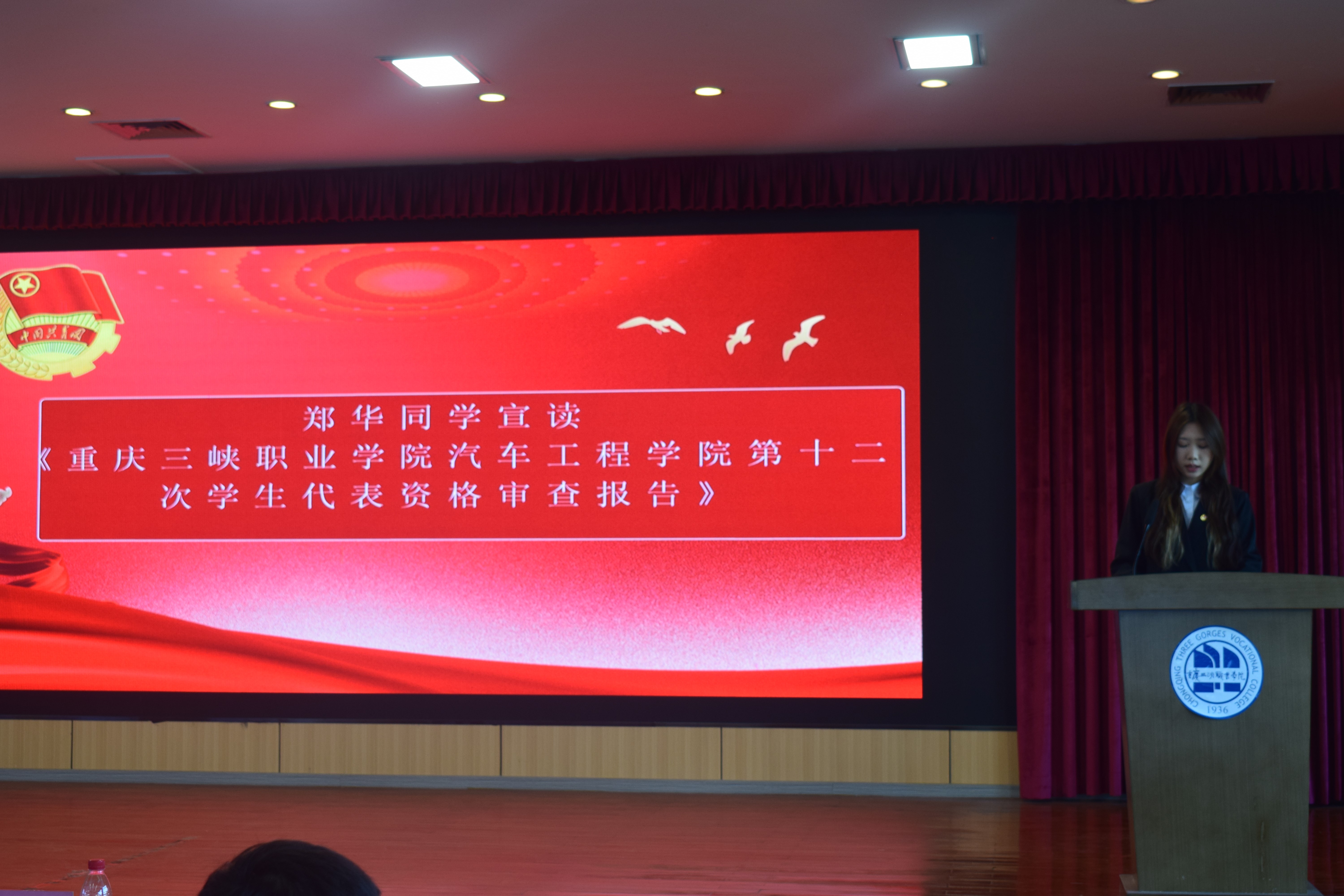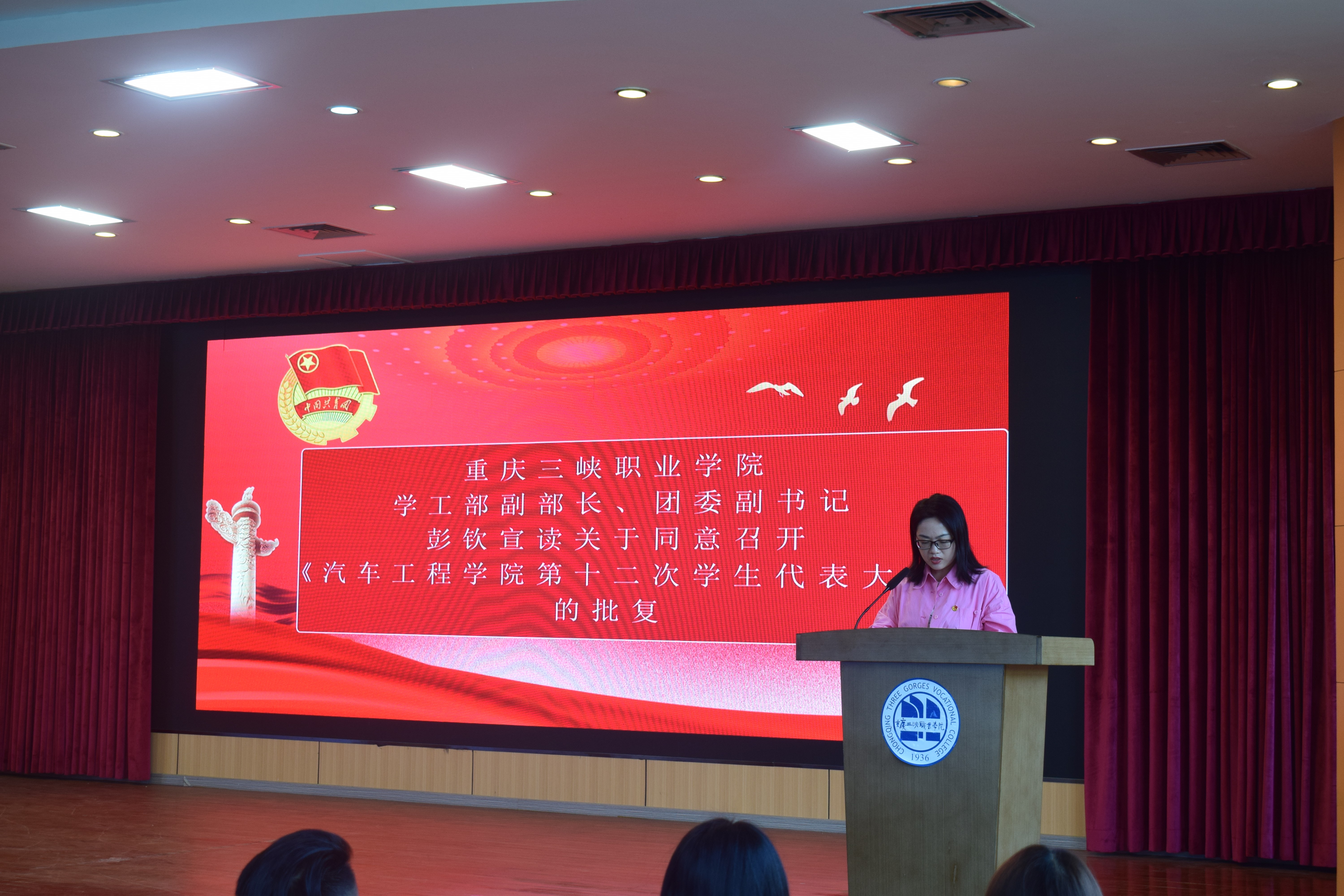 会议在庄严的国歌声中正式开幕。重庆三峡职业学院学工部副部长、团委副书记彭钦宣读《关于同意召开汽车工程学院第十二次学生代表大会的批复》。