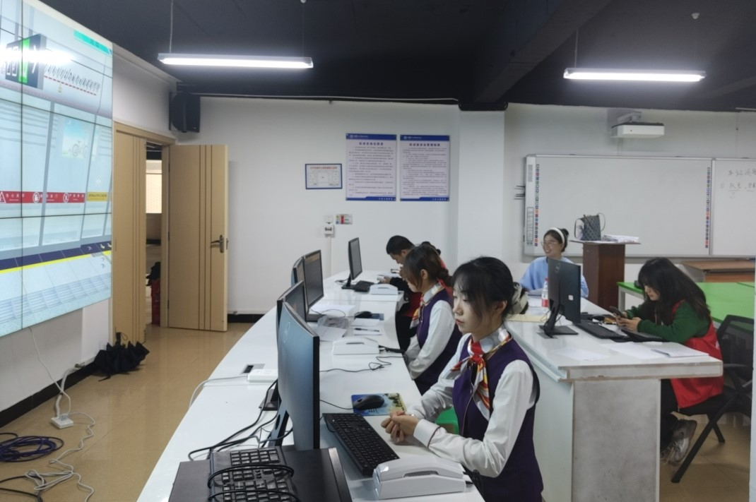 在轨道交通站务接待赛项中,实操模拟线路包括人身安检、物品安检和应急处理等环节,要求两个队员合作完成,身份相同,均担当站务员和安检员。