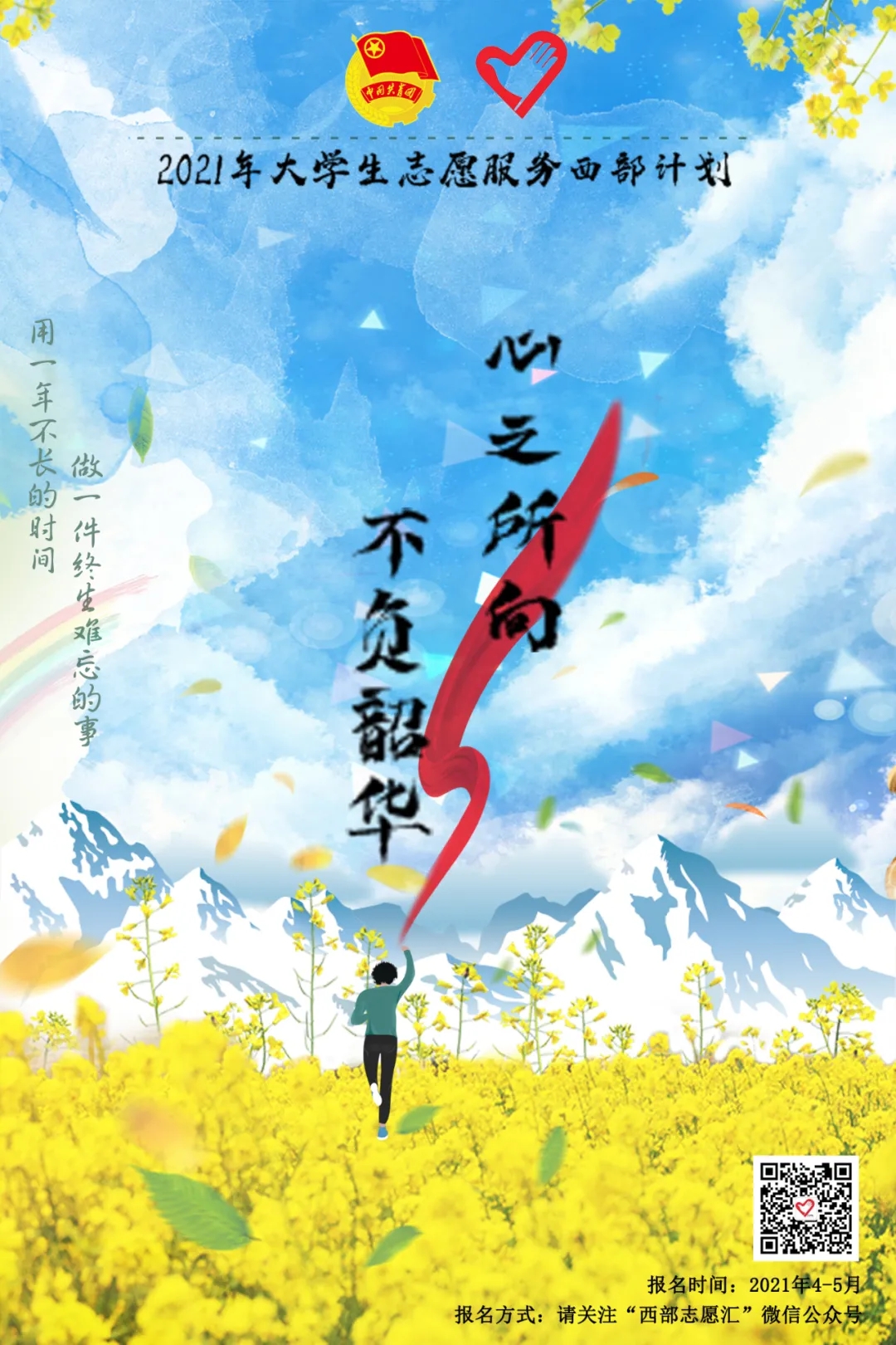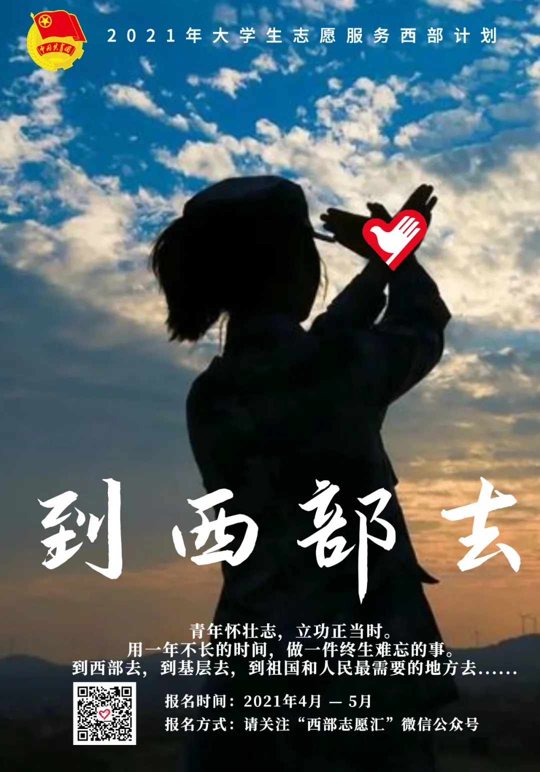 即日起至5月20日,2021年普通高等学校应届毕业生或在读研究生可通过微信公众号“西部志愿汇”(菜单栏中的“我要报名”)或登录西部计划官网(http://xibu.youth.cn),在西部计划报名系统中进行注册报名。