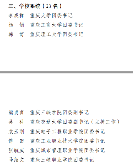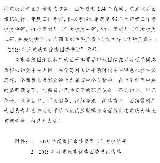 近日,共青团重庆市委下发了《关于2019年度共青团工作目标考核结果的通报》(渝青发〔2020〕5号),我校在2019年度重庆市共青团工作目标考核中成绩优异,考核结果为“特等团组织”。我校团委书记马绍文荣获“2019年度重庆市优秀团委书记”荣誉称号。