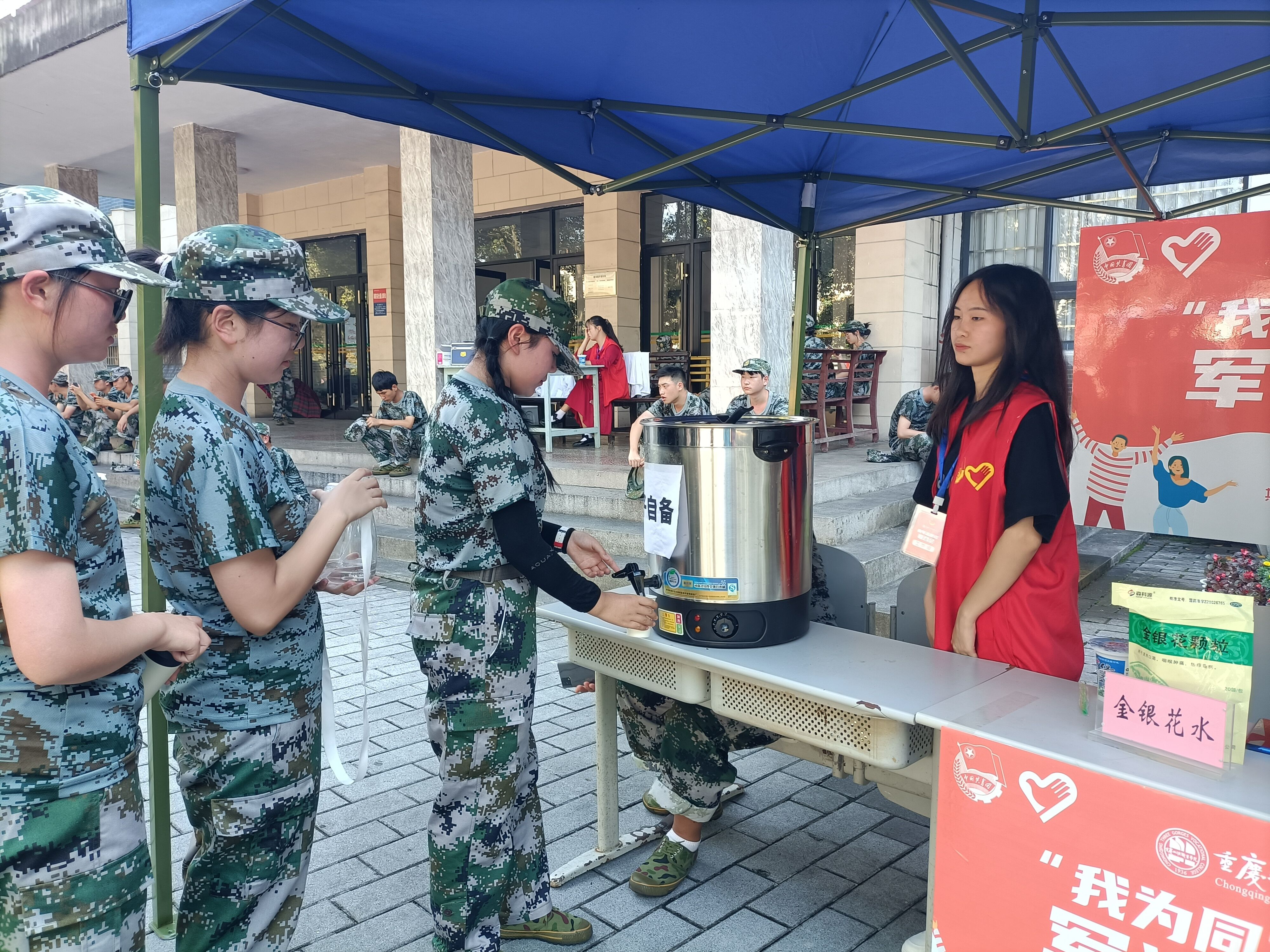军训期间,学院团委分别在图书馆和操场2通道处设立了两个军训服务中心,为萌新们提供温水、金银颗粒等送清凉服务,让小萌新们在紧张的军训中,也能感受到温暖。