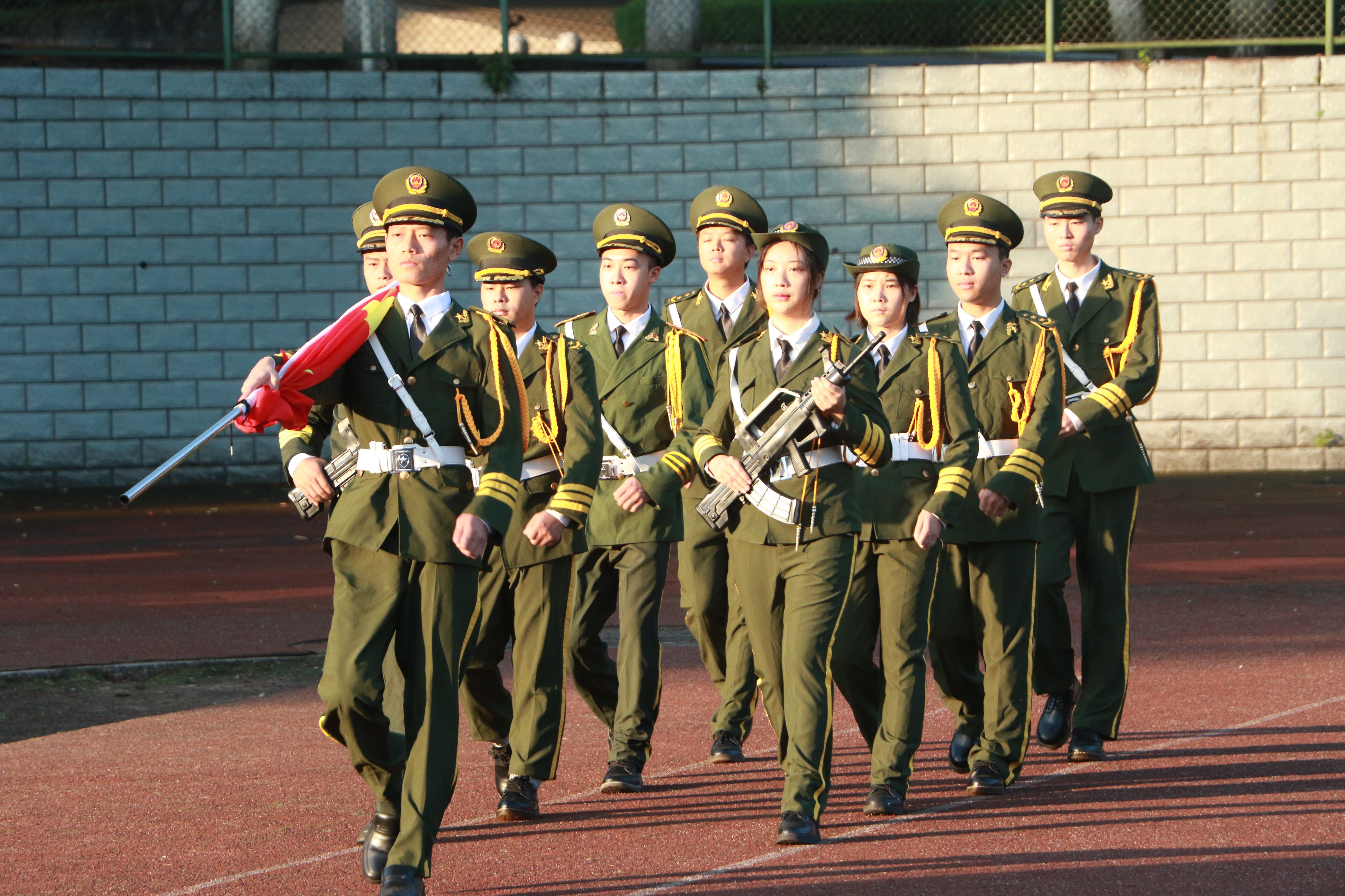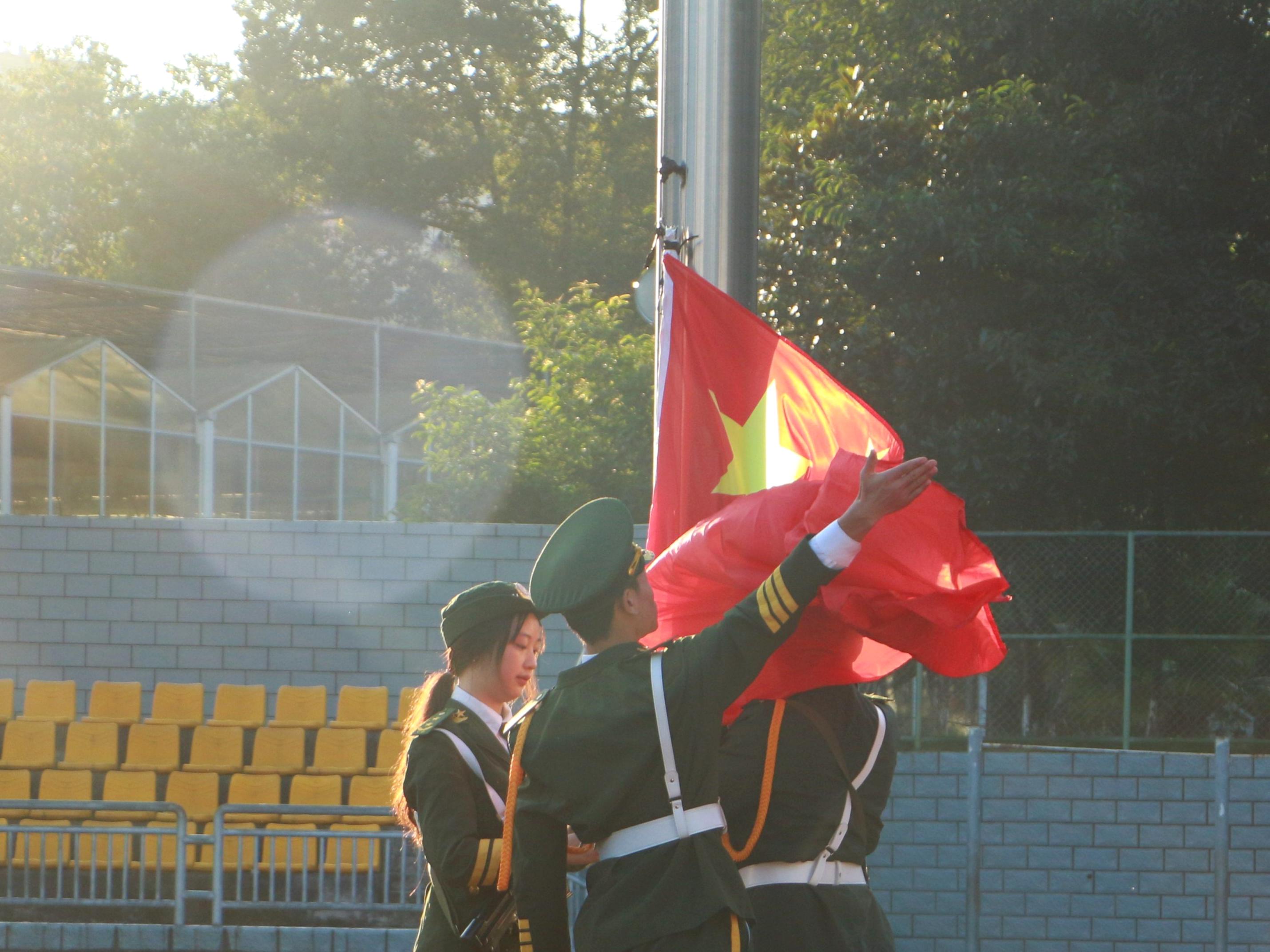 伴随着国旗护卫队坚毅的脚步声,整个校园奏唱起庄严的国歌,国旗伴随着朝阳冉冉升起。