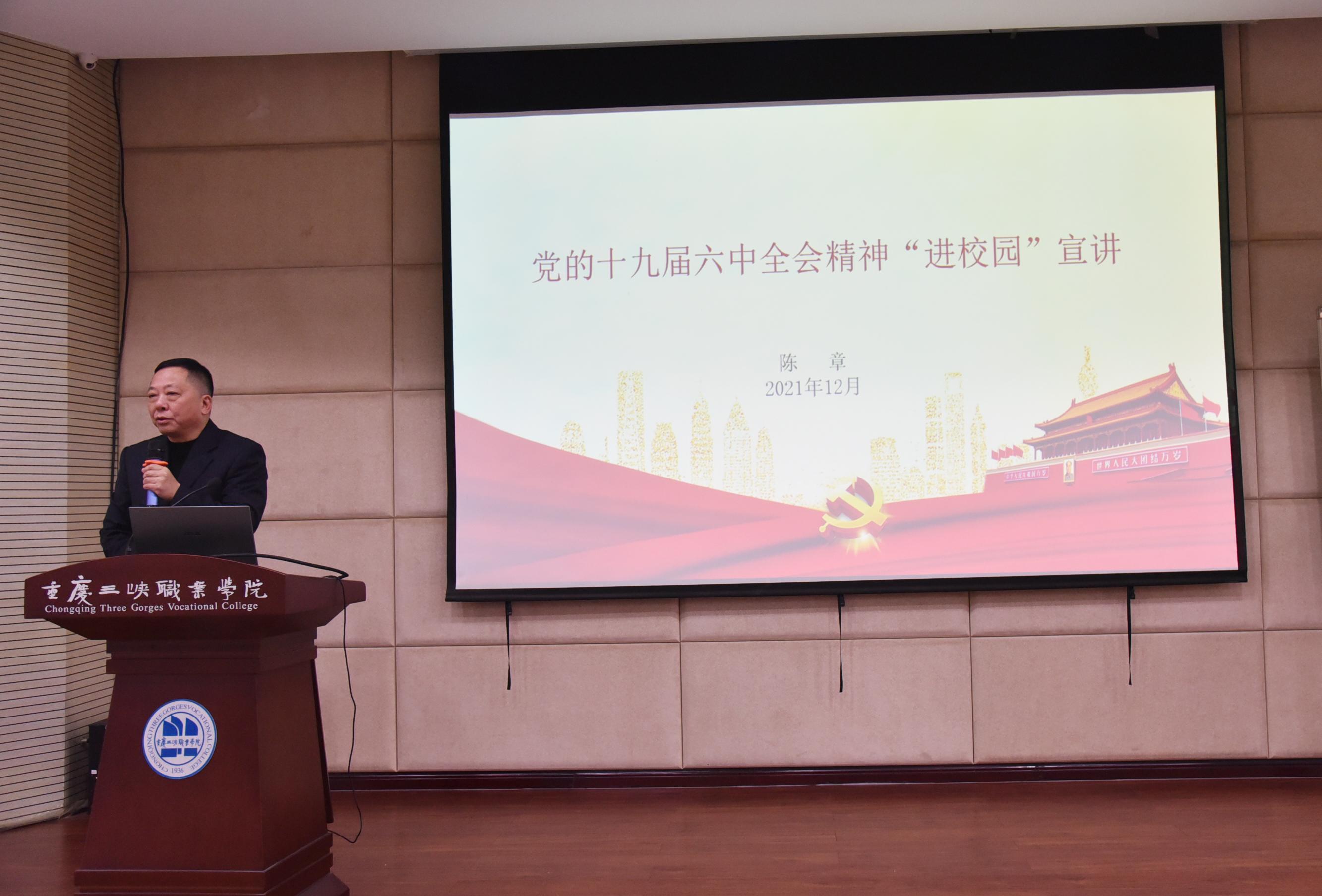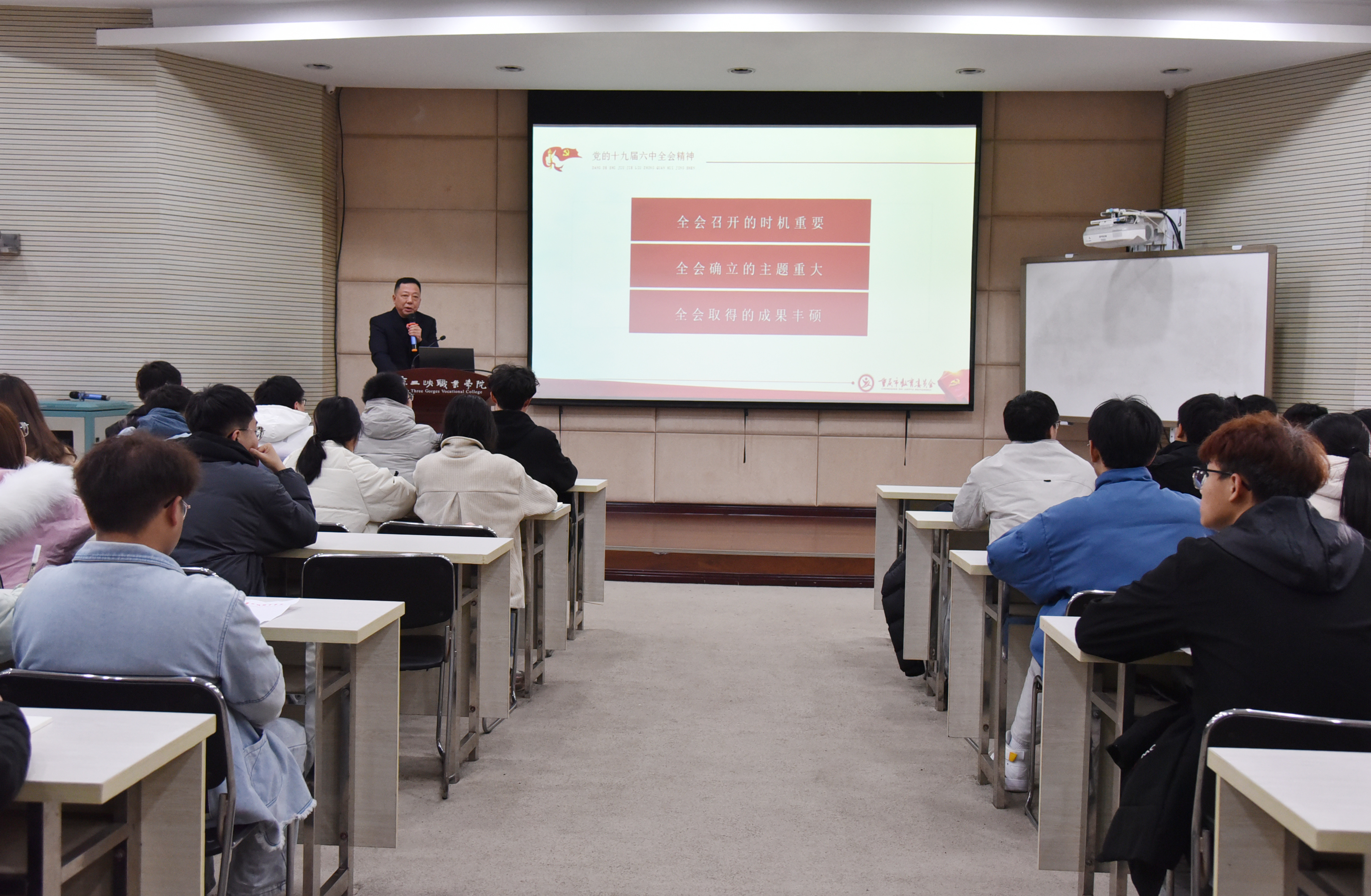 12月21日,学院党委书记陈章作学习党的十九届六中全会精神专题宣讲。学院团学骨干、学生代表150人聆听讲座。学院党政办主任、团委书记马绍文主持宣讲会。