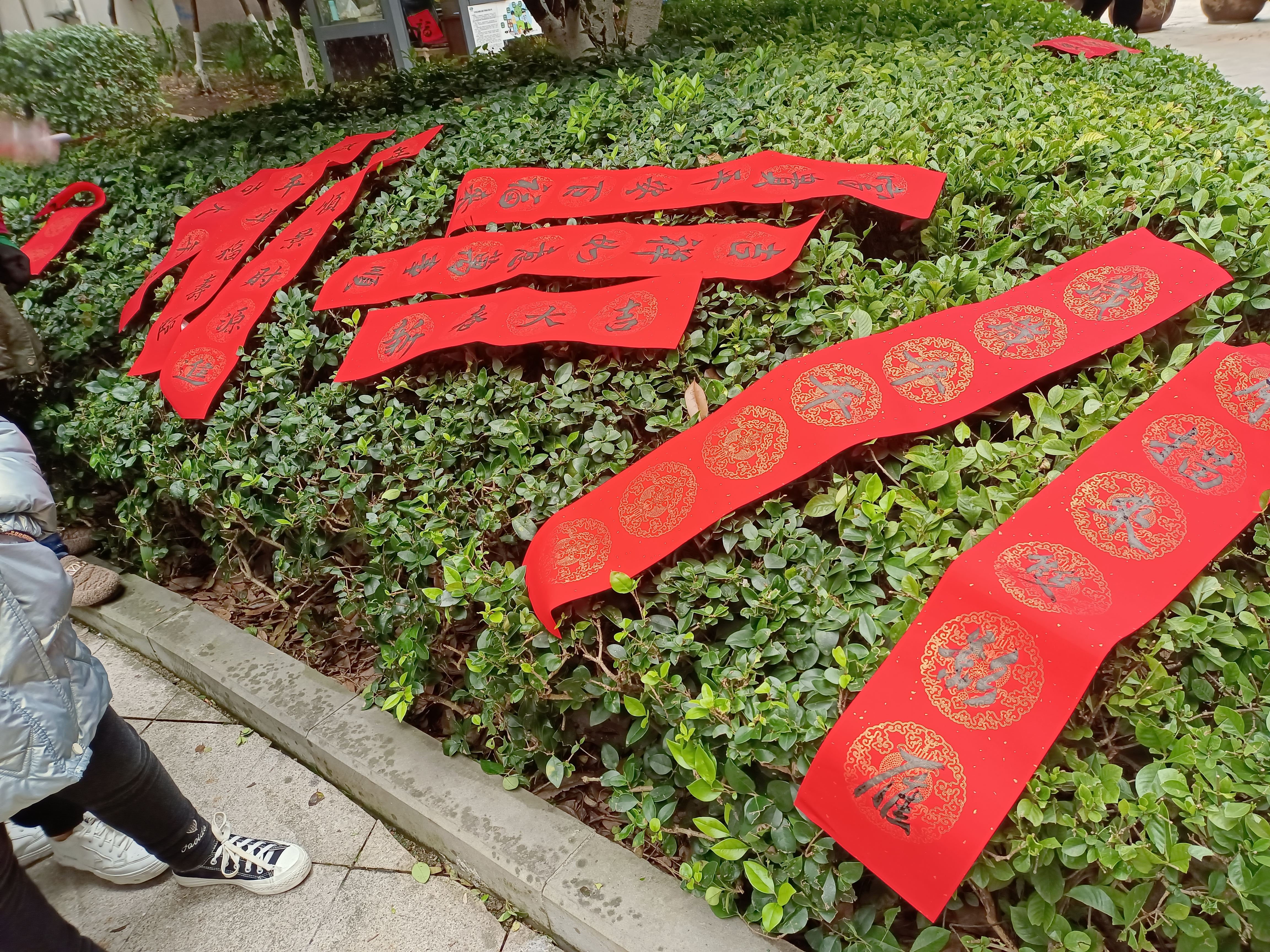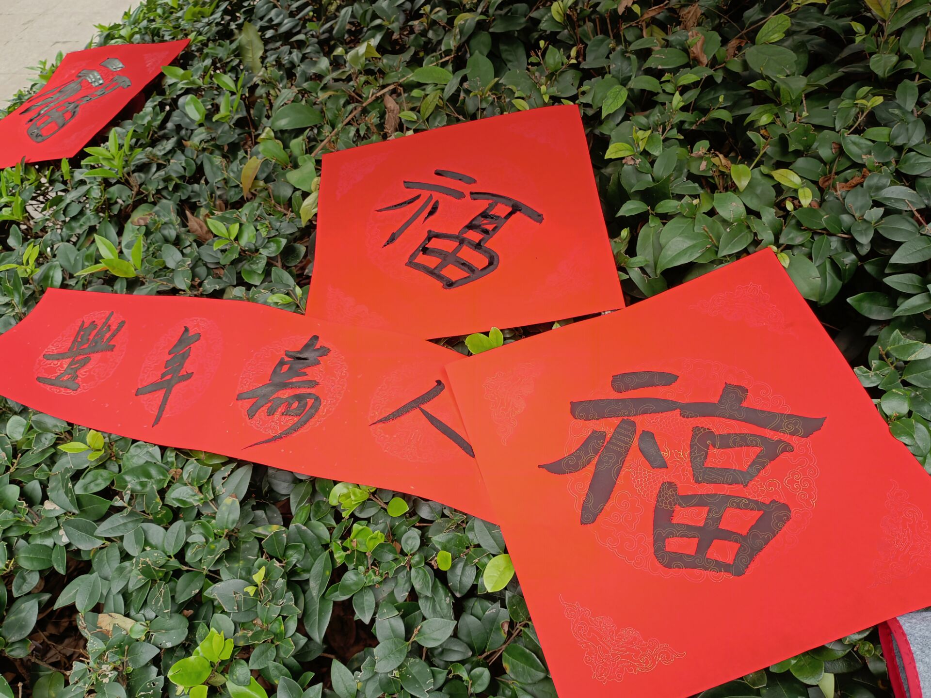 当志愿者们布置好场地后,立刻引起了社区居民的注意,我院志愿者们一展身手,一笔一划顿挫有力,吸引了不少社区居民前来观看。志愿者们铺开红纸、蘸好笔墨、凝神聚气,在红彤彤的纸上,写下了一幅又一幅苍劲有力、潇洒自如的“福”字和春联。许多居民排队领取对联,喜悦之情溢于言表,纷纷为我院学子风采点赞。