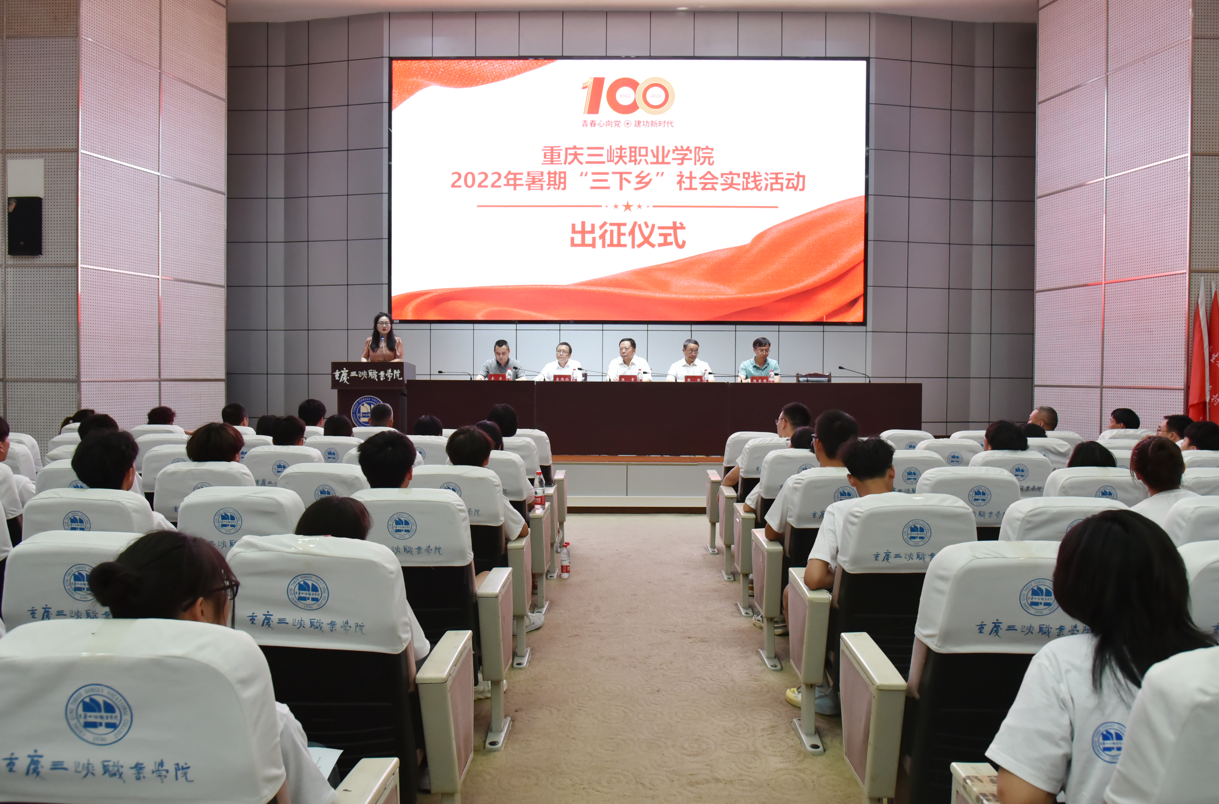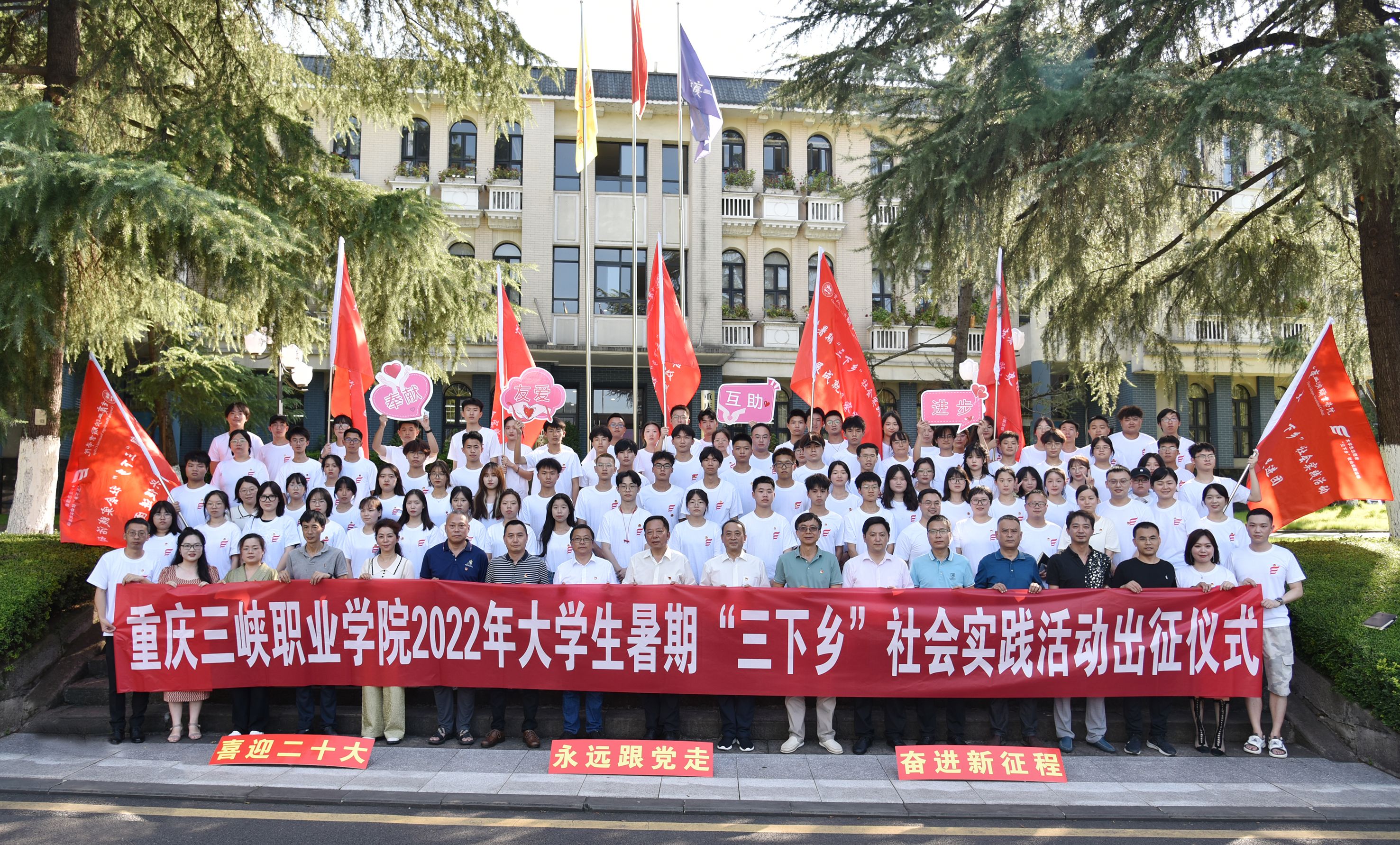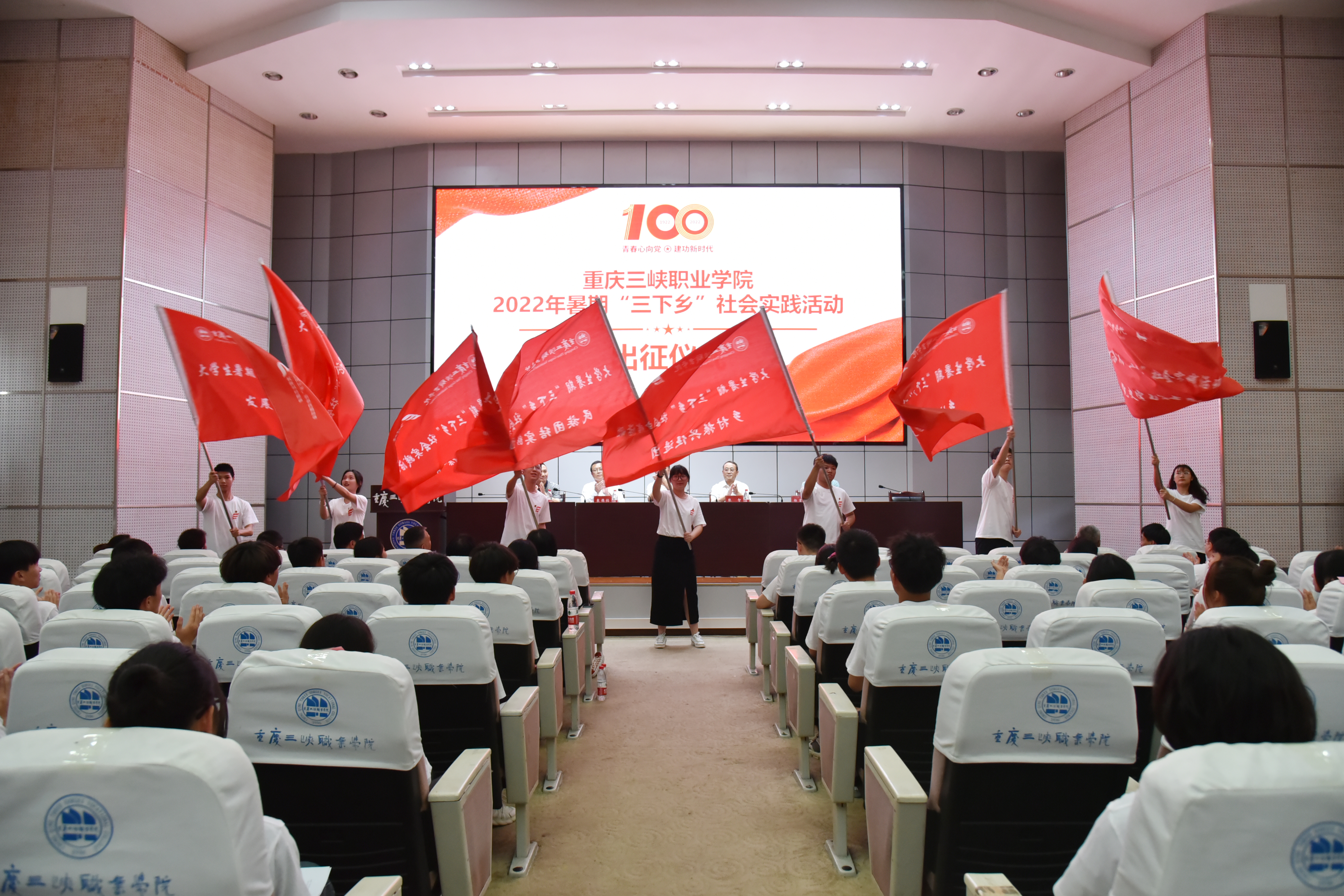 7月7日下午,我院2022年暑期“三下乡”社会实践活动出征仪式在学术报告厅举行。学院党委书记陈章,学院党委副书记张智,学院党委委员、副院长袁德梽,学院党委委员、统战部部长杨吉林,学院党委委员、宣传部部长姜荣,以及学生处、团委全体老师,各学院党总支书记、团总支书记,指导老师、大学生志愿者近200人参加仪式。