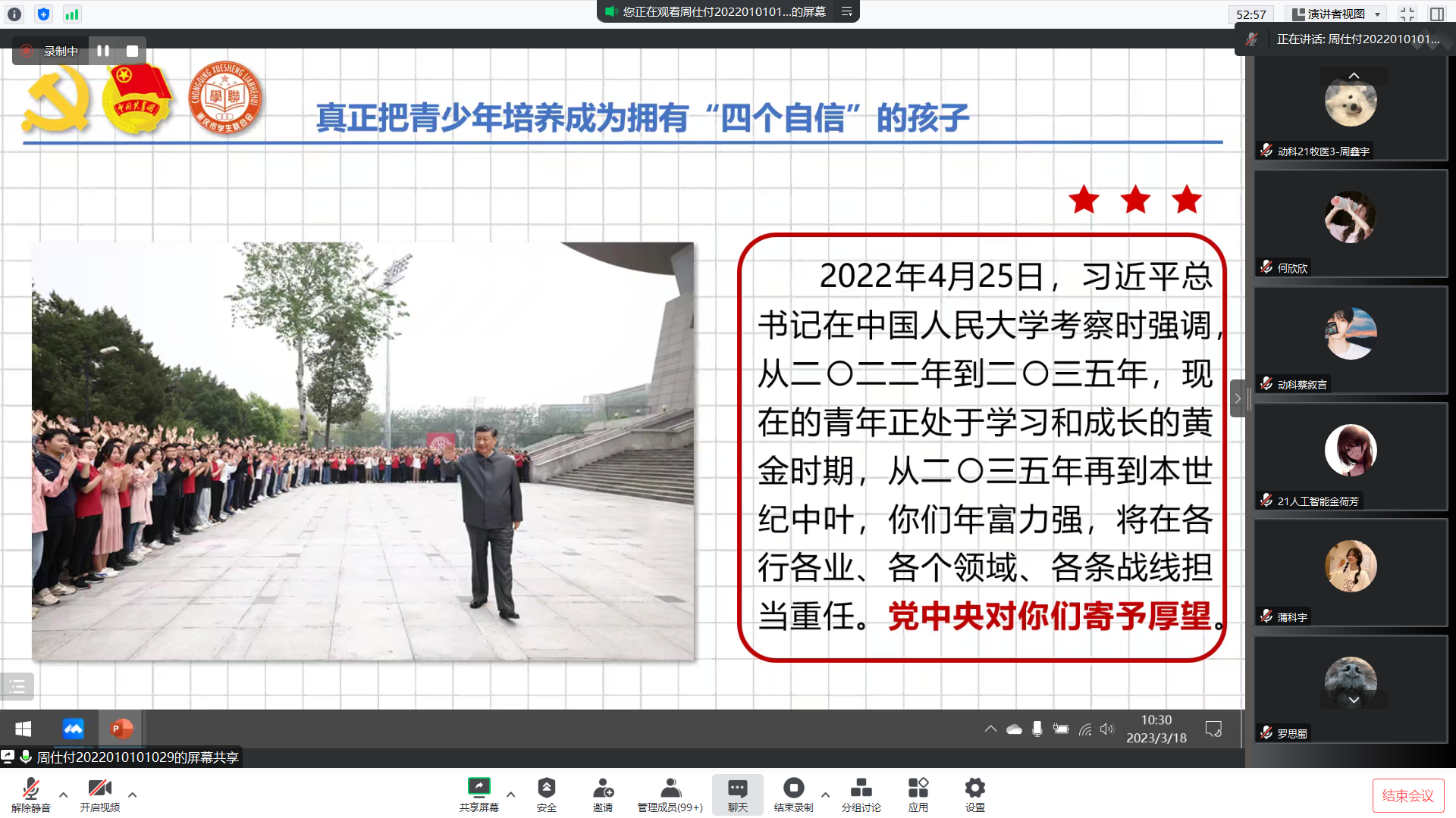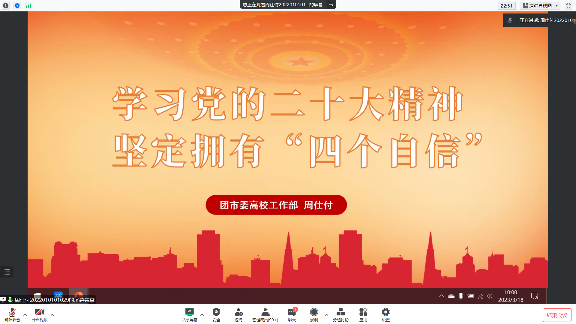 周仕付副部长以《学习党的二十大精神,坚定拥有“四个自信”》为主题,围绕党的二十大的主题和主要成果、过去5年的工作和新时代10年的伟大变革等方面,通过理论阐释、事例解读,对党的二十大精神作了系统讲解,周仕付还深刻阐述了坚定“中国特色社会主义道路自信、理论自信、制度自信、文化自信”的重大意义,并引导广大团员青年要坚定“四个自信”,将个人奋斗的小目标融入党和国家事业的大蓝图,在心与心的交流对话中汇聚青春共识,在手拉手的并肩前行中会就美好图景。