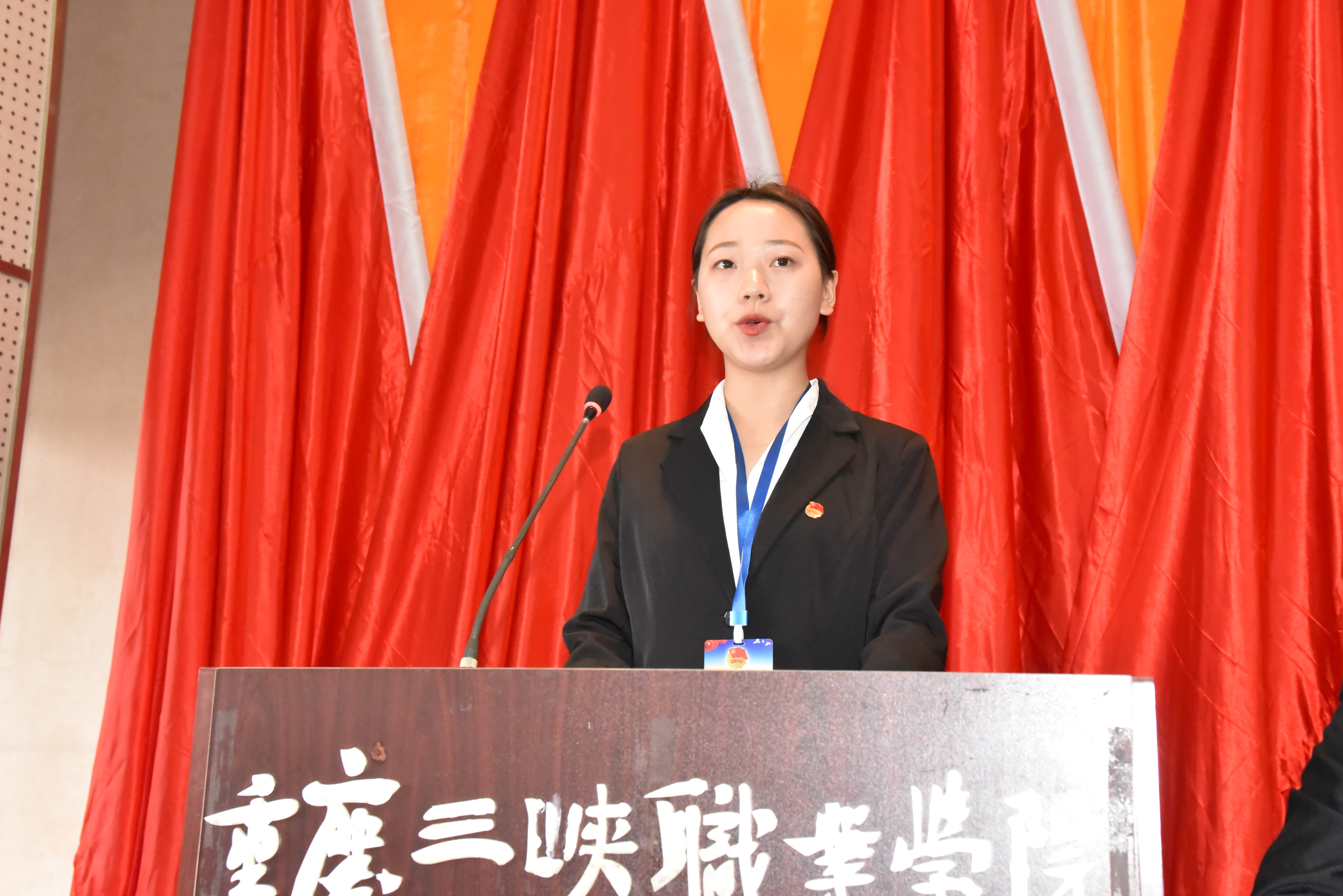 张雨同学代表重庆三峡职业学院第七届学生委员会作了题为《激扬青春志 奋斗新时代 为建设重庆前列行业领先全国一流的高职院校贡献青春力量》的报告。报告回顾了第七次学代会以来的工作,从坚定理想信念、聚焦服务同学、夯实自身建设三方面总结了工作成果,同时指出了工作中存在的一些问题。报告还提出了下一步学生会的工作重点,期待通过坚定理想信念、推进自身建设、践行服务宗旨的方式开展工作。