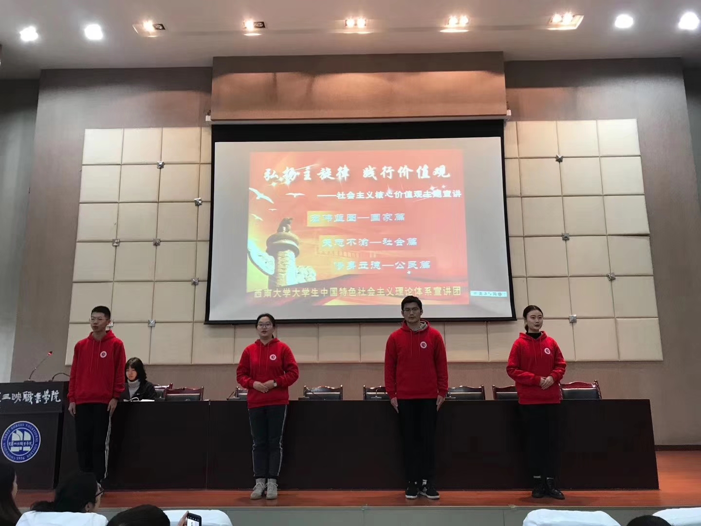 相信通过本次宣讲,会让我校学子对社会主义核心价值观有更加明确清晰的认识,在今后的学习、生活、工作中将会结合实际情况,充分利用特长优势,发挥主观能动性,努力将社会主义核心价值观深入自己的内心,成为基本的价值观念,成为自觉的生活方式,让社会主义核心价值观在我们重庆三峡职业学院校园落地生根。