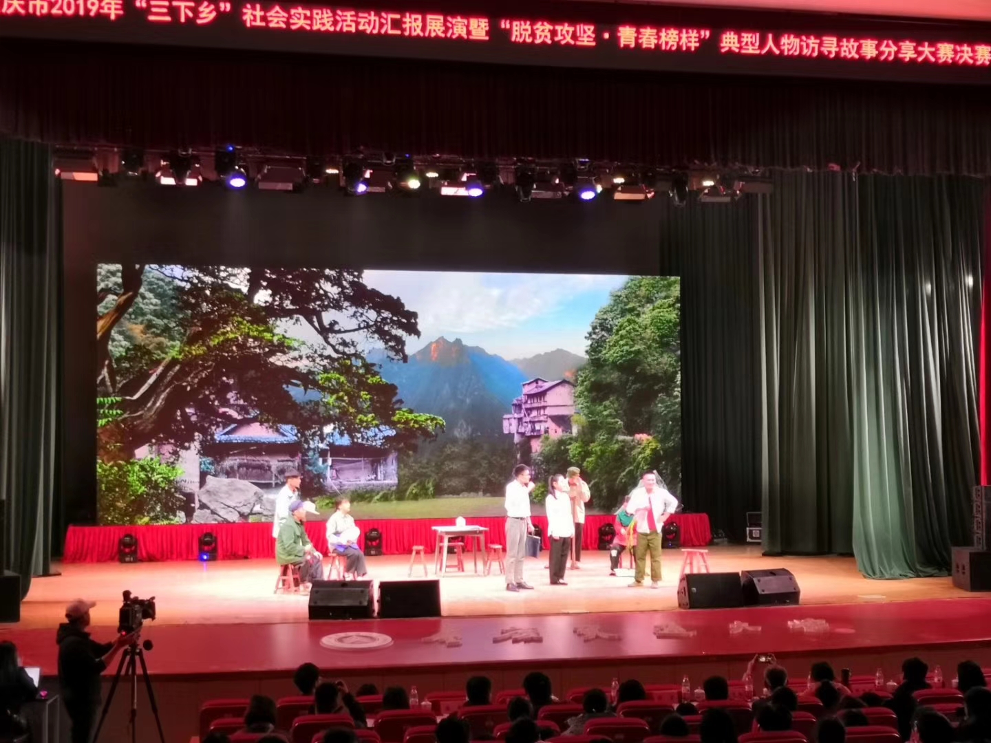 比赛过程中,来自西南大学、重庆师范大学等13所重庆市高校的学生穿着志愿服、农民服、工作服,带着“三下乡”时使用的扫帚、背篓等工具,用演讲、舞蹈、相声、朗诵等形式,演绎他们在各区县投身志愿服务、积极参与脱贫攻坚、奉献青春力量的故事。