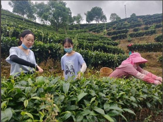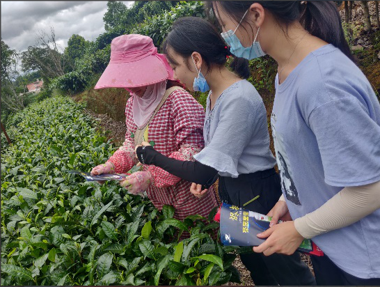韩露、仲亚非、林子力、田兴为四位同学去了云南普洱。普洱是普尔茶的产地,队员们跟随茶农去到当地的茶园,了解了种植模式、管理方法以及农药使用,体验了采茶的劳作过程,调研了周边产业情况,尽己所学致力于普及农药知识,助力当地脱贫攻坚。