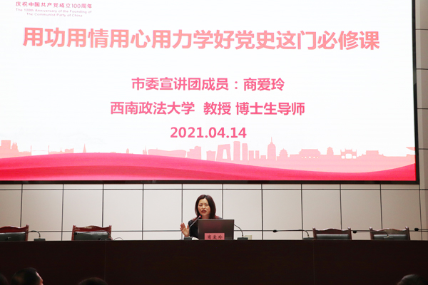 4月14日,我校开展党史学习教育专题宣讲。市委宣讲团成员,西南政法大学教授、博士生导师商爱玲作宣讲报告。党委书记陈章主持报告会并讲话。