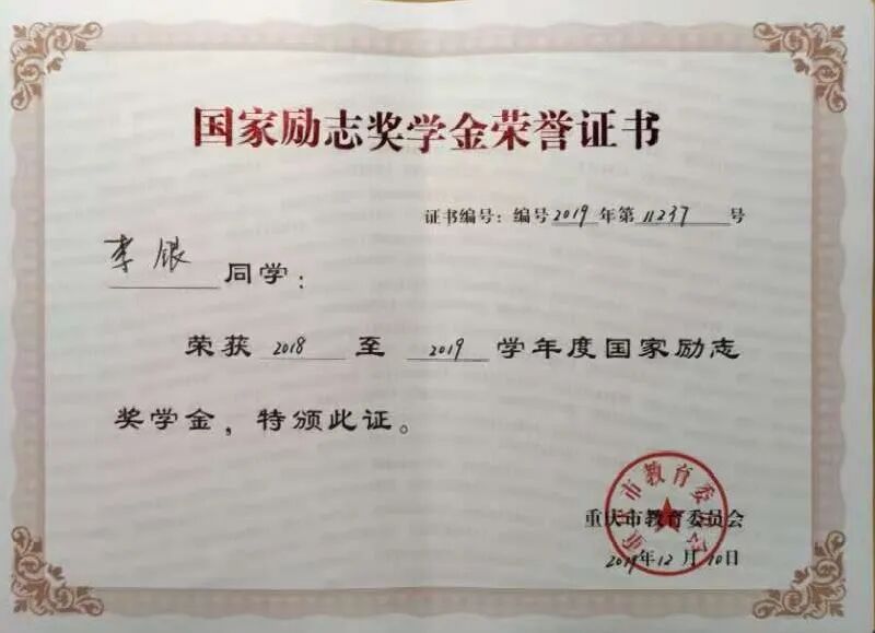 2019年9月,荣获重庆三峡职业学院一等奖学金;