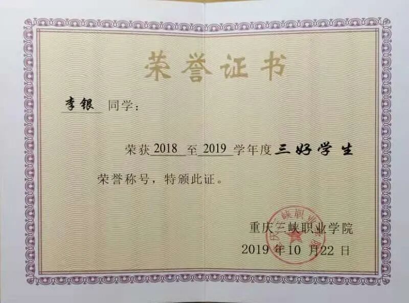 2019年11月,荣获重庆三峡职业学院“三好学生”、“创新能力提升个人”荣誉称号;