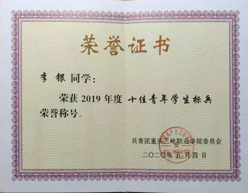 2020年5月,荣获重庆三峡职业学院“优秀共青团员”、“十佳青年标兵”荣誉称号。