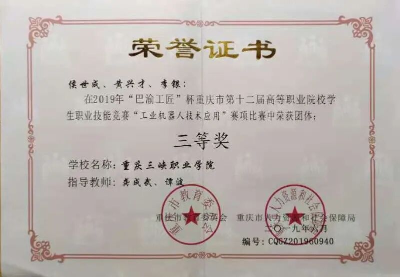 2019年6月,荣获重庆市“巴渝工匠杯”工业机器人技术应用项目三等奖;