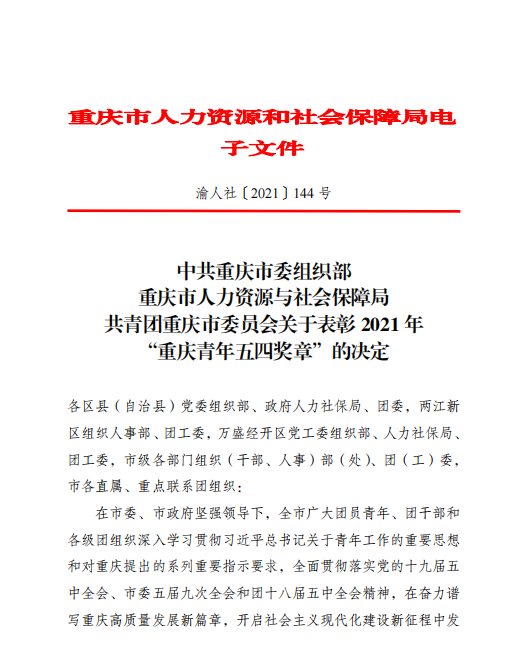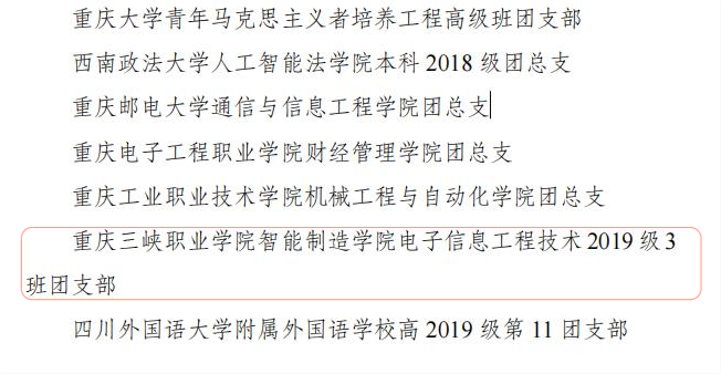 近日,中共重庆市委组织部、重庆市人力资源和社会保障局、共青团重庆市委联合下发了《关于表彰2021年“重庆青年五四奖章”的决定》(渝人社〔2021〕144号),我校智能制造学院电子信息工程技术2019级3班团支部被授予2020年度“重庆市五四红旗团支部”称号。