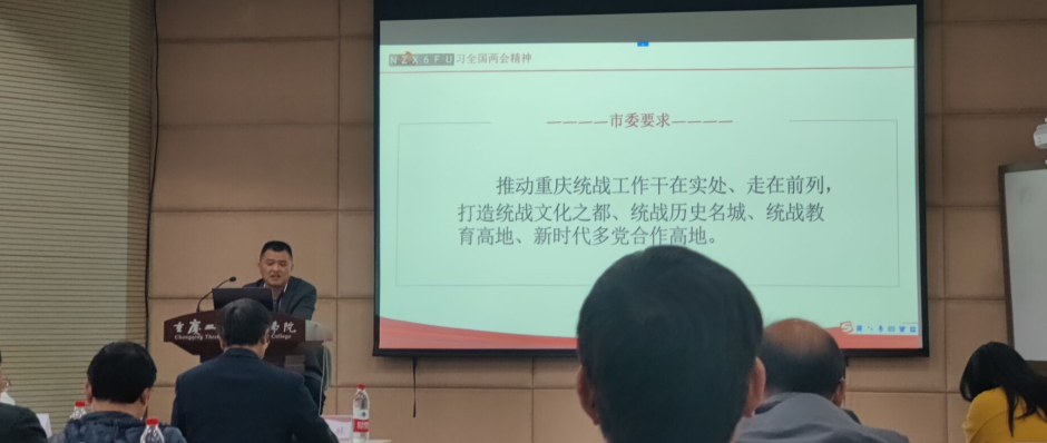 为提升党外人士参政议政能力,党委统战部于2023年3月21日下午2点,在博雅楼207会议室,邀请中共重庆市委统战部康程老师来我校开展建言献策的专题讲座培训。会议由学院党委委员、统战部部长杨吉林同志主持,学校各民主党派(知联会)成员参会,同时重庆三峡医药高等专科学校、重庆安全职业技术学院的党外人士受邀参会,共50余人。