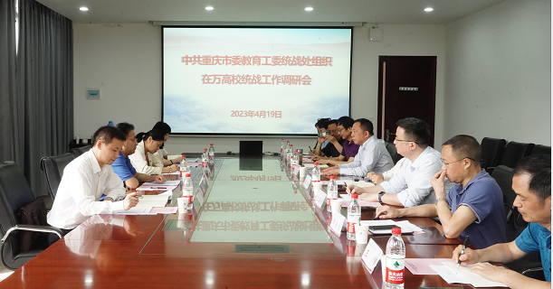 为认真贯彻落实《中共重庆市委统一战线工作领导小组办公室关于印发〈关于开展党外知识分子工作示范点创建工作的意见〉〈关于开展“五好”知联会创建工作的意见〉的通知》(渝统组办〔2021〕5号)要求,进一步了解高校统战工作的基层基础工作情况和统战“双创”工作情况,中共重庆市委教育工委统战处于2023年4月19日上午10点,在我校行政楼312室召开在万高校统战部长会议,调研高校统战工作。市教育工委范晓霞巡视员、统战处郭冠仁处长、彭维炜副处长等出席,郭冠仁处长主持会议,我校党委书记陈章同志和在万高校统战部长参会。