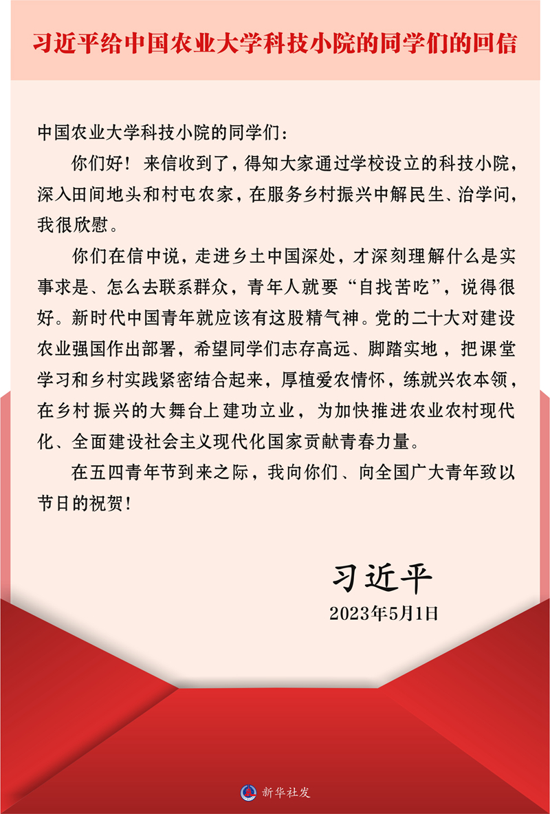 习近平在回信中说,得知大家通过学校设立的科技小院,深入田间地头和村屯农家,在服务乡村振兴中解民生、治学问,我很欣慰。