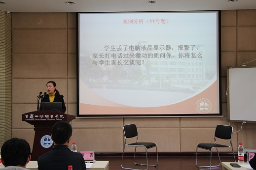 最后,学院副院长杨建宏作总结讲话,他指出,辅导员职业技能大赛是增强辅导员队伍内部交流、提高辅导员业务能力和专业水平的重要举措,对促进辅导员队伍建设,夯实学生工作基础,推动学生工作质量提升有着非常重要的意义。他希望,学院今后每年定期举办辅导员职业技能大赛,并推选优秀的辅导员参加重庆市乃至全国的辅导员技能大赛。