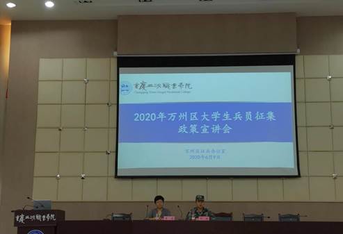 近日,万州区人武部主办我校承办的2020年大学生兵员征集政策宣讲会在博雅楼学术报告厅隆重举行。学校学生处副处长黄莉,万州区人民武装部科长吴燕出席并参加了本次活动。