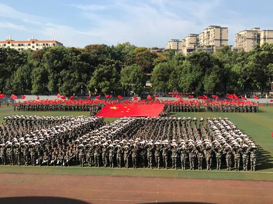 优雅温暖的诉说爱国深情。战场救护和教官擒敌拳则向我们展示了新生专业的训练成果与昂扬向上的精神风貌。最后,伴随《歌唱祖国》的嘹亮歌声,80面国旗由旗手朝气蓬勃的挥舞着入场,方阵摆出的“中国”和“70”的字样, 在“1949,2019,不忘初心,牢记使命”铿锵有力的口号,让鲜艳的国旗在阳光下更显炙热。