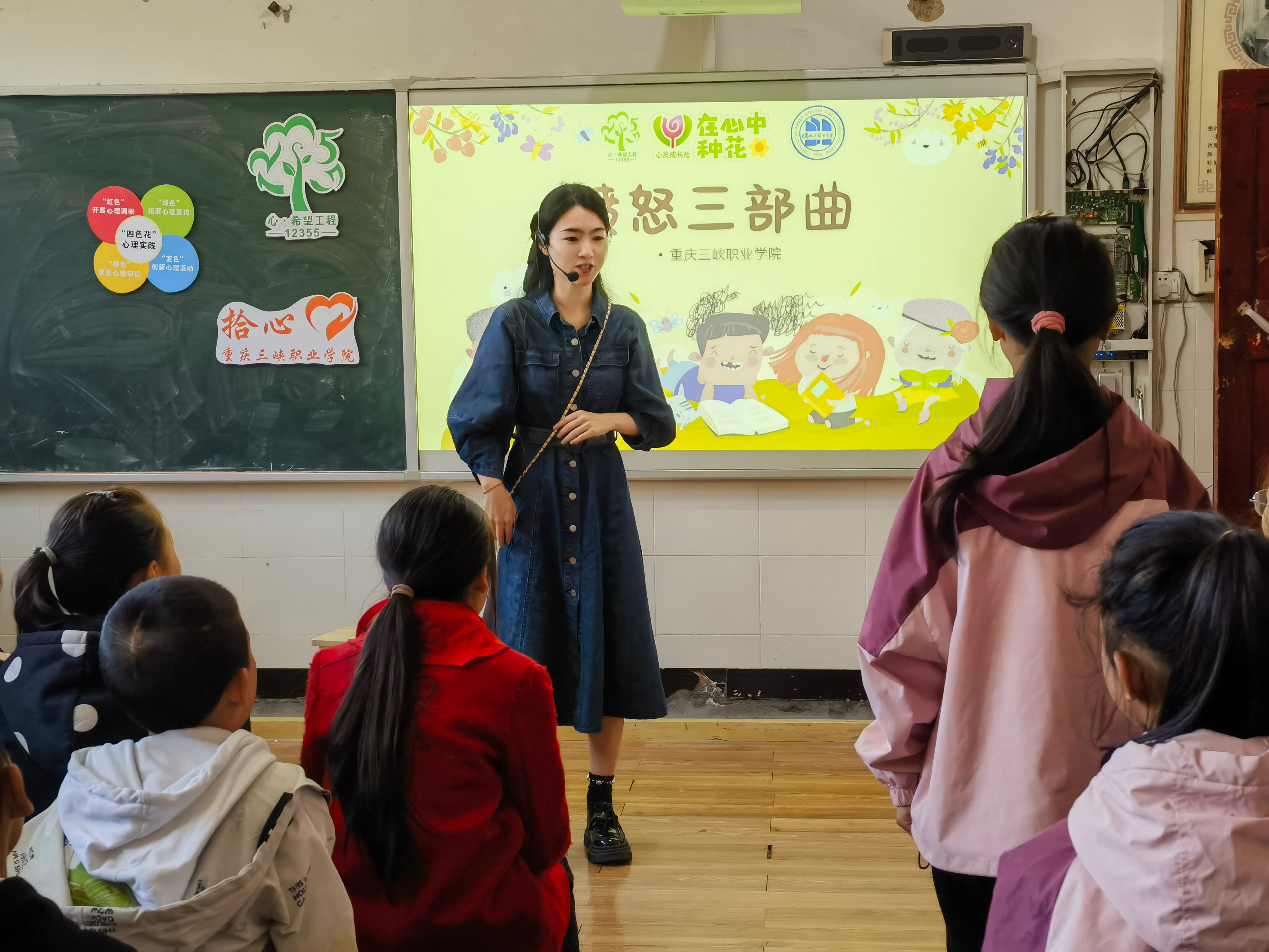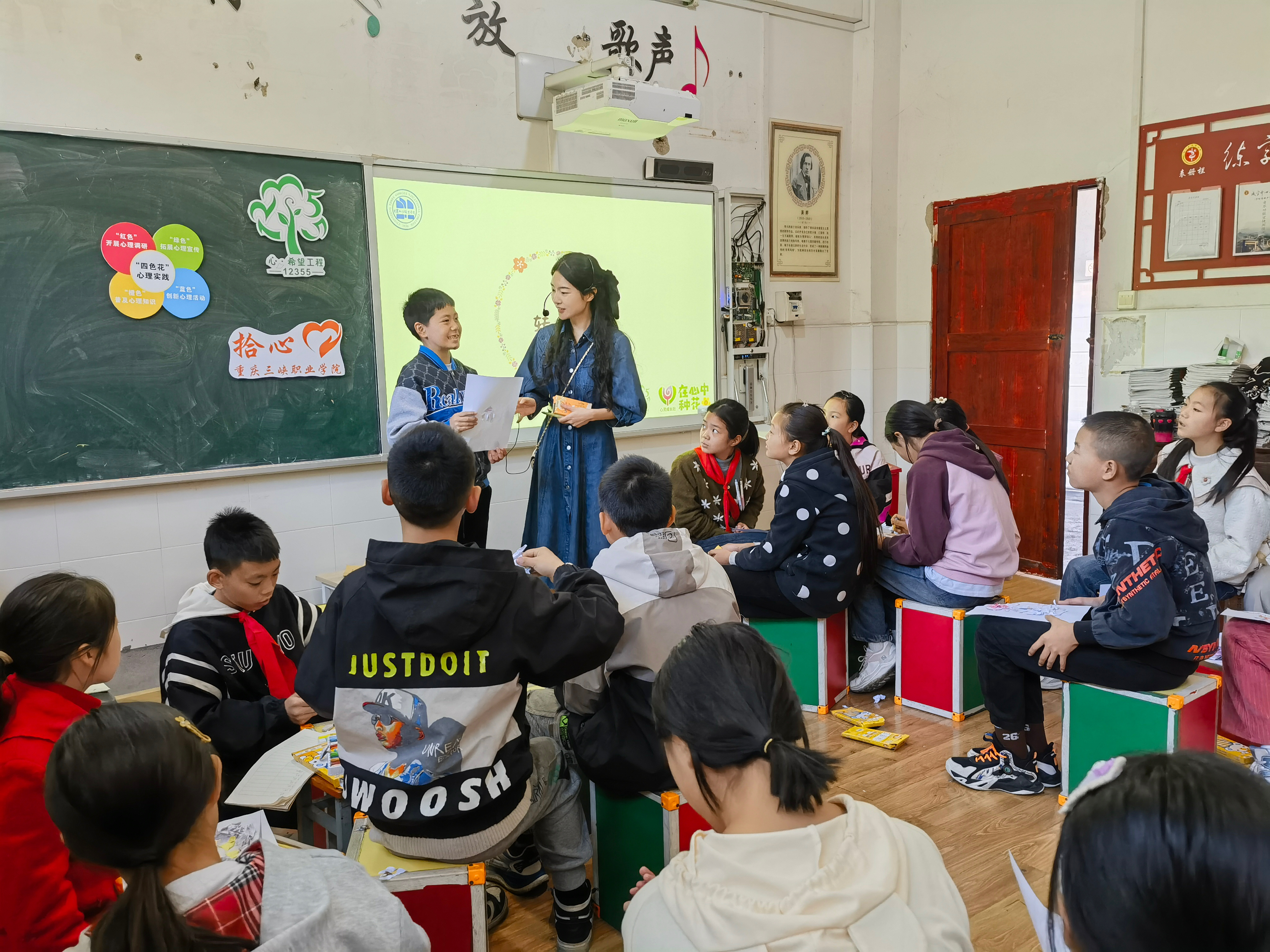 据悉,重庆三峡职业学院“拾心四色花”心理健康品牌项目由心理健康调研(红色)、心理健康知识(橙色)、心理健康活动(蓝色)和心理健康宣传(绿色)构成。在本次共建活动中,学院心理教师为咸宜镇中心小学五、六年级的学生开展了“普及心理健康知识(橙色)、创新心理健康活动(蓝色)普及心理健康宣传(绿色)”三项心理实践活动。活动以情绪管理为切入点,进行了情绪知识心理知识讲解、宣传了接纳多种情绪的心理健康理念、开展了愤怒三部曲和情绪小怪兽等心理健康团辅活动,引导学生正确认识自己的情绪,学会有效应对愤怒、悲伤等不良情绪。此外,学校与咸宜镇中心小学开展了心理健康调研(红色)交流会,进一步了解了咸宜镇中心小学学生们的心理健康现状和需求。基于座谈与活动的结果,双方就下一步共建的内容达成了共识,将在团辅、个辅、教学指导和心理危机干预等方面夯实举措,为持续推进大中小心理健康教育一体化共建奠定坚实的基础。
