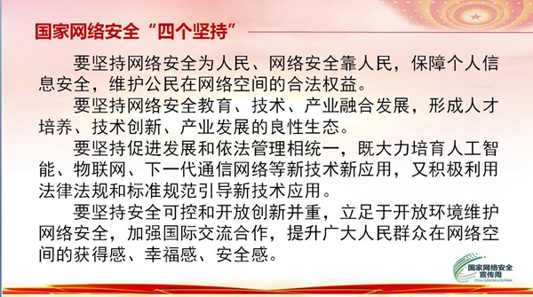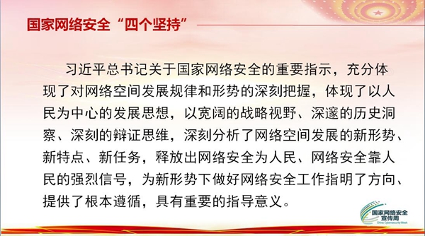 2019年9月16日至22日是第六届国家网络安全宣传周。9月16日,习近平总书记对国家网络安全宣传周作出重要指示,提出了国家网络安全“四个坚持”的原则要求。10月18日,教育部科技司就学习贯彻习近平总书记重要指示精神专门下发通知,要求充分认识习近平总书记重要指示的重大意义,认真组织学习传达、全面落实习近平总书记重要指示精神。