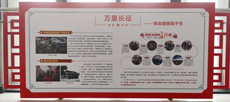 党史主题展板以“红色曙光”拉开篇章,从1921年的中共一大到1937年的抗日烽火,宣告中国共产党的正式成立到中国共产党的发展壮大;从1949年开国大典到1978年十一届三中全会,中华人民共和国正式成立到改革开放拉开帷幕;从2012年党的十八大到2017年党的十九大,从伟大复兴的中国梦到习近平新时代中国特色社会主义思想,每一次大会的重要精神和历史意义,都被提炼成了精简的文字叙述,8块图文并茂的展板贯穿百年时间轴。