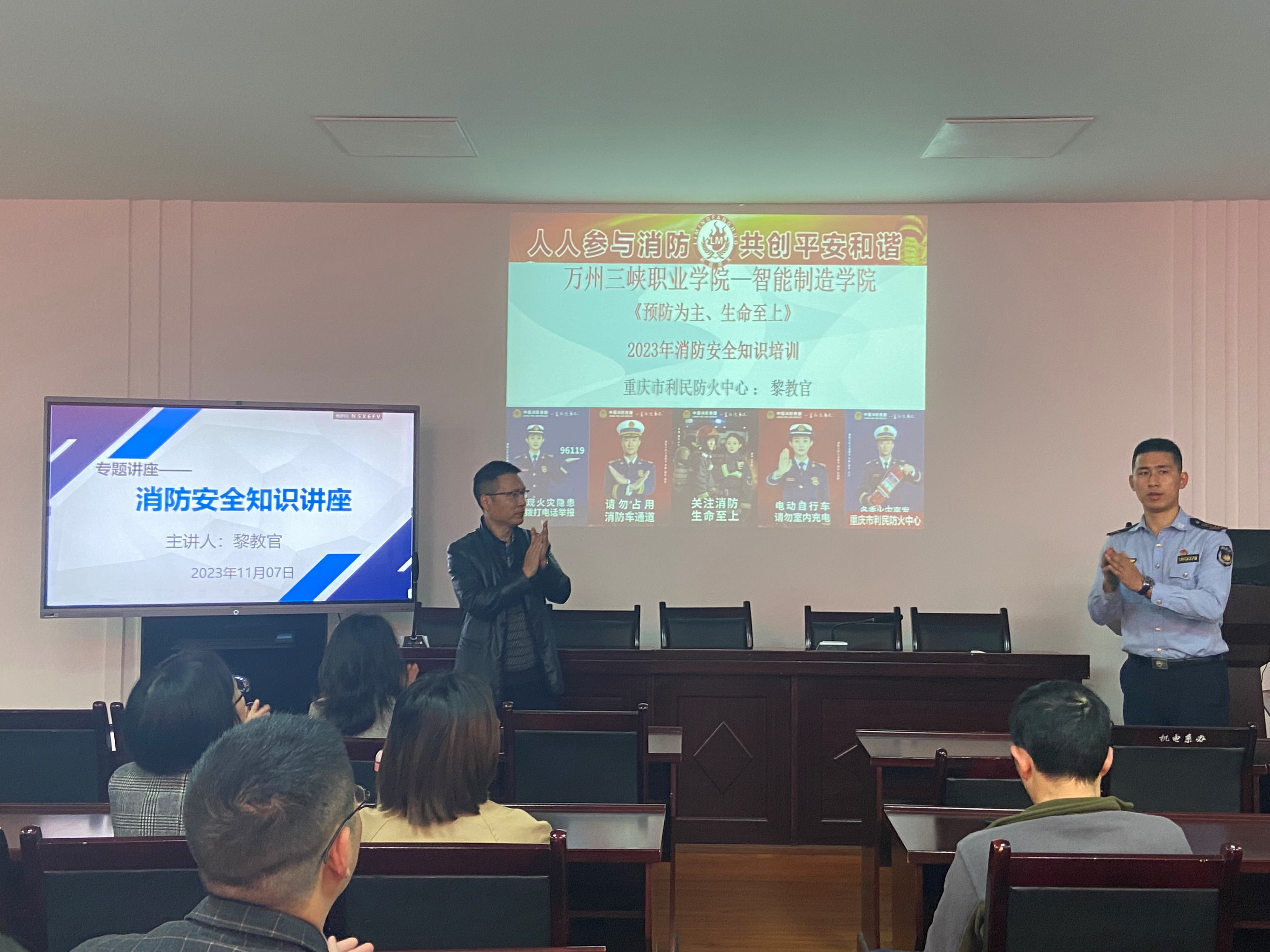 为增强全院师生的消防安全意识,提高个人应急避险与自救能力,11月7日,智能制造学院特邀重庆市利民防火中心的黎教官开展《预防为主、生命至上》消防安全知识讲座,智能制造学院全体教职工共同参与学习培训。