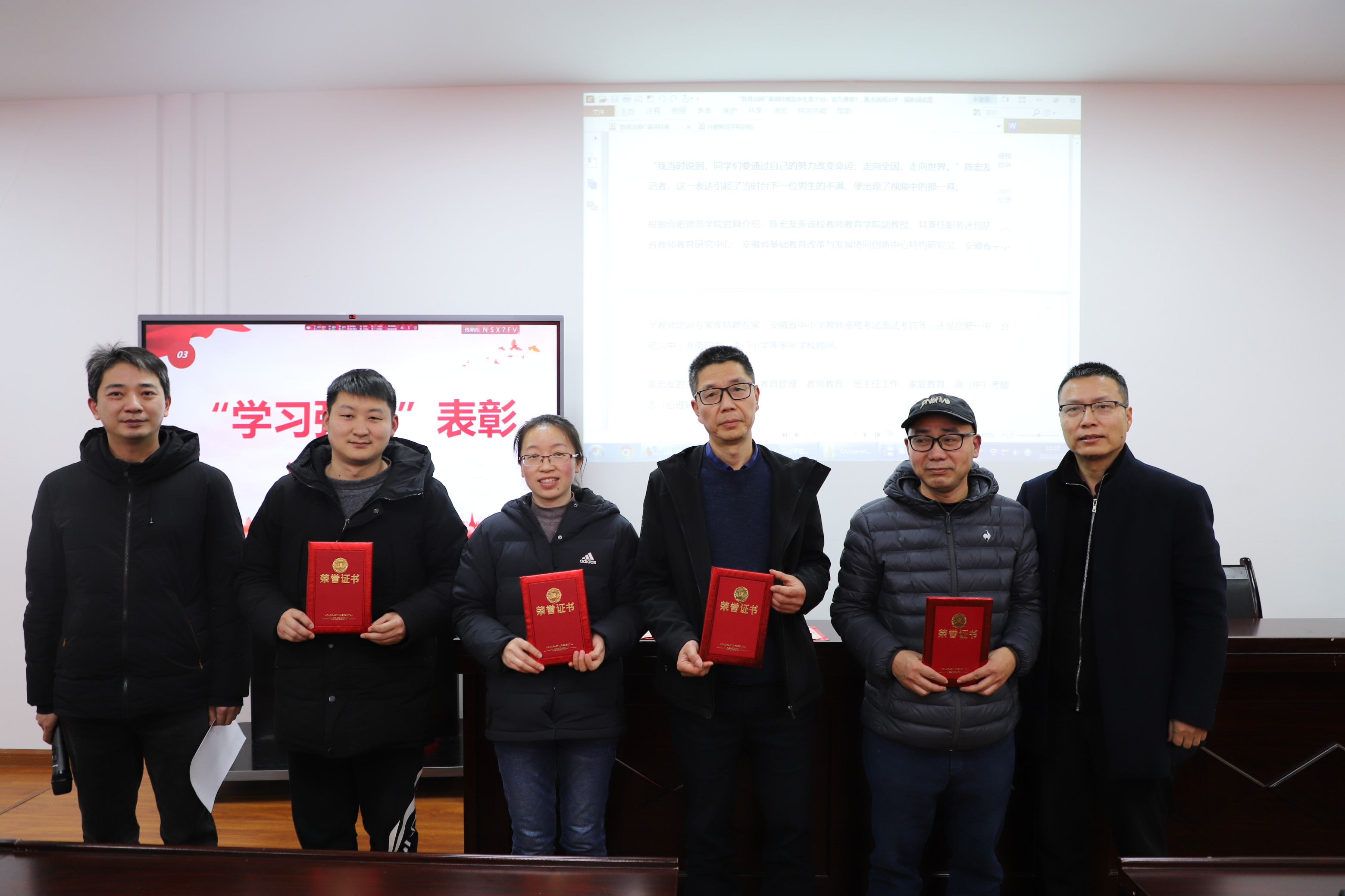根据“学习强国”APP学习积分排名,学院对2022年度积分排名前18名教师颁发了荣誉证书和奖品。学院党总支副书记黄滔宣布表彰名单,党总支书记熊江为获奖教师颁奖。