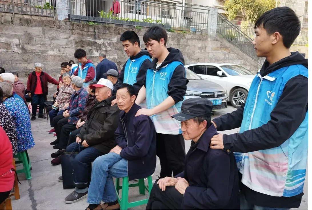 松林包是一个老年人居住率比较高的小区,在社区工作人员的组织安排下,爷爷奶奶们有序的在社区院坝围坐欣赏学员们精心准备的才艺表演,在欣赏表演的同时,其他学员分别为爷爷奶奶按摩、为他们修剪指甲、陪他们聊天、下棋,学员们的精彩演出、用心用情的陪伴赢得了爷爷奶奶的掌声和赞美。