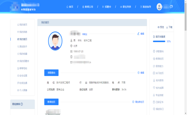点击个人中心>左边菜单栏选择【我的简历】>根据要求完成简历信息,默认会显示基本信息,只有>=60%才可以投递并展示在企业端。请尽快完善自己的个人简历,以提高简历和面试通过率。